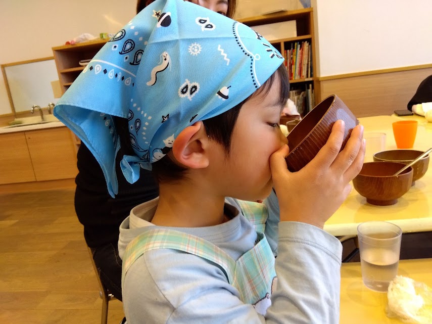 何杯もおかわりに行く子もいるほど、あら汁もとてもおいしく出来上がり、「おいしいね」と共有しながらみんなで一緒に食べる時間を楽しみました。