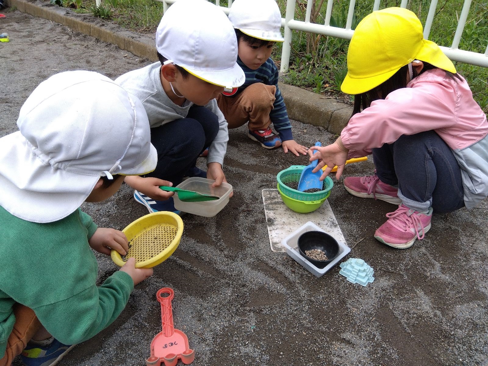 砂利が広がるだけの広場でも、子どもたちの手にかかればあっという間に遊びの宝庫になります。子どもたちに呼び止められて向かった先では、砂をふるいにかけ、粒の大きさのちがう砂で何品ものお料理をつくっているところでした。粒の大きい砂は肉だんご、小さい砂はごはんです。