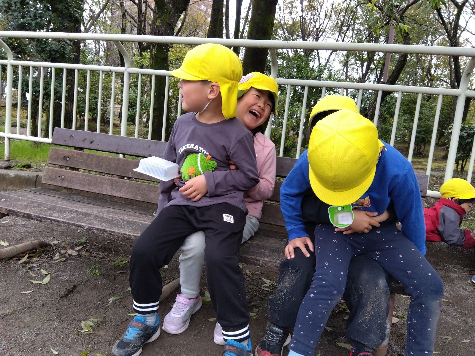 おにごっこでたくさん走った後は、ベンチに座ってちょっと休憩します。そんなときでも笑顔が絶えません。明日はどこにいこう。どんな遊びをしよう。どんな発見があるかな。今年度もたくさんの楽しみを見つけられるよう、過ごしていきたいと思います。