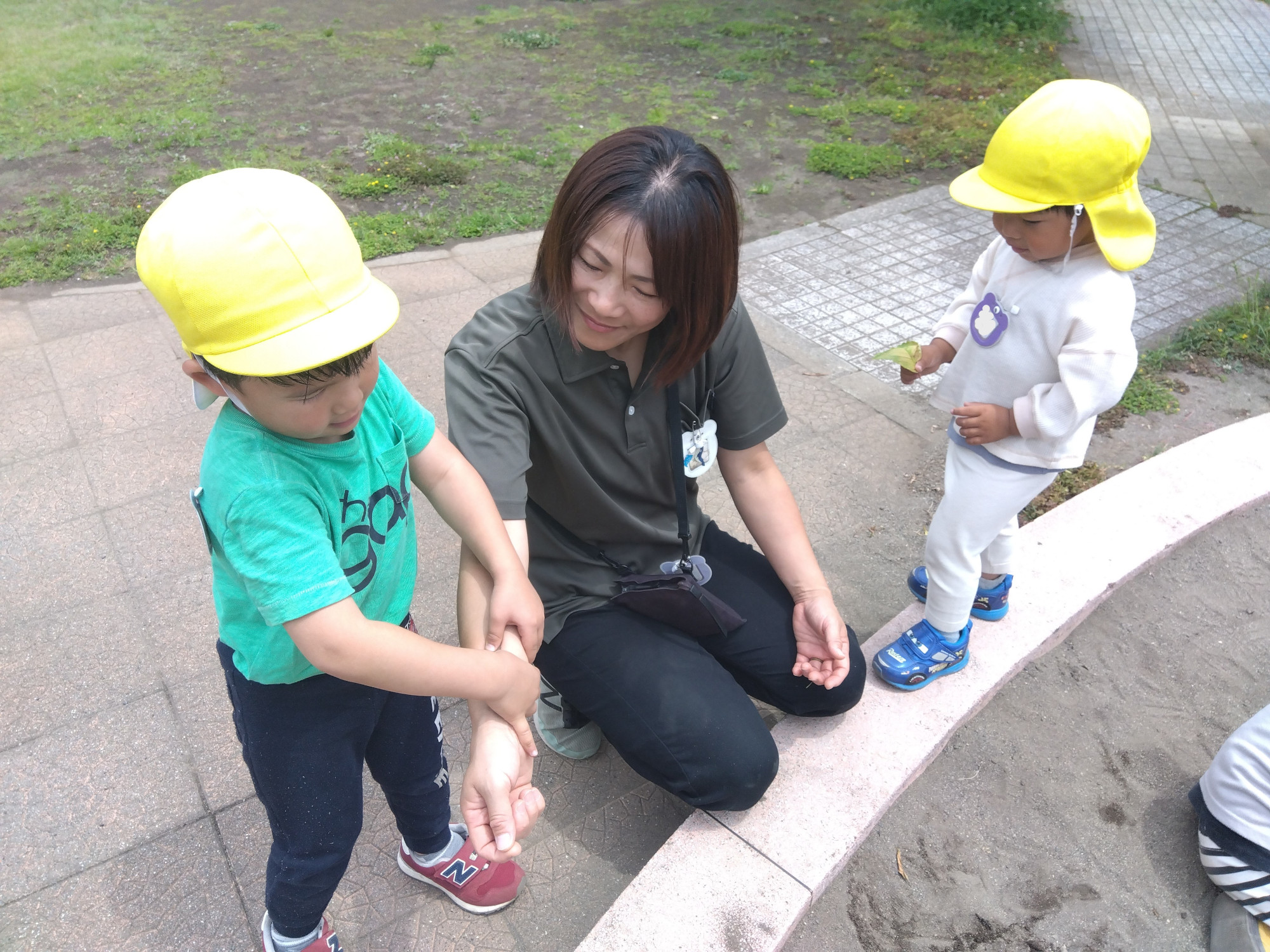「今日は遊ぶのは、おしまいだよ」「手をつないできた子と並んでね」と保育園に帰ることをスタッフが伝えましたが、座り込み、まだまだ遊びたかったことを示します。一緒にしゃがみ、「まだ遊びたかった?」と聞くと頷いてくれたため、「まだ遊びたかったよね、でも今日はおしまいのお時間なんだ。○○くんと一緒に帰って給食食べたいな」と気持ちを受け止め、落ち着くまで隣で待ちます。5分程経ち「帰る?」と尋ねると頷き、一緒に立ち上がり歩き始めることができました。