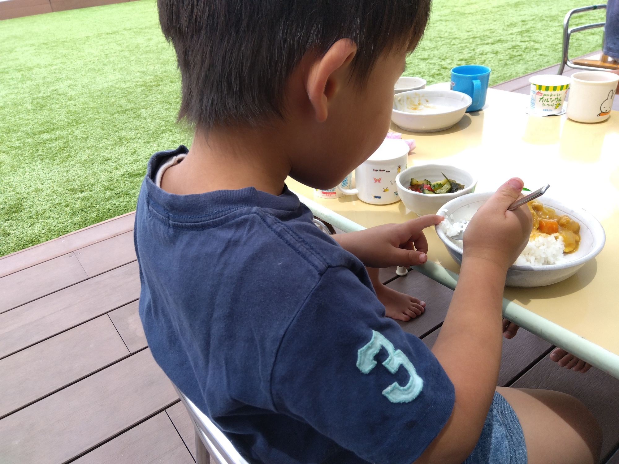 たくさん遊んだ後は、汚れた洋服を着換え、待ちに待った給食です。席を決め、自分で食べることができる量をお皿に盛って、準備をします。今日は天気が良いので、園庭でスタッフと友だちと机を囲んで「いただきます!」。