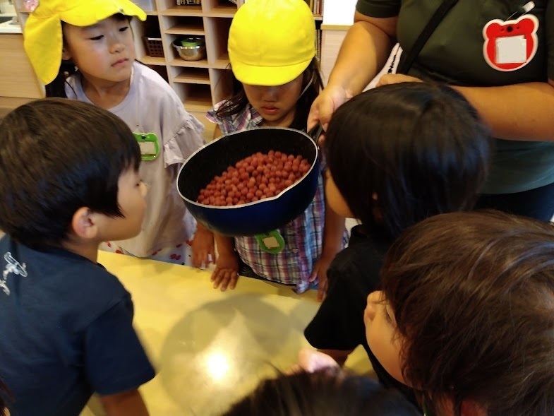 そのあとは、たっぷりの水で洗い、ゆでた実をザルでこしていきます。ザルをおさえる役とスプーンでこす役を交代でおこないながら、一生懸命に取り組む姿がみられました。