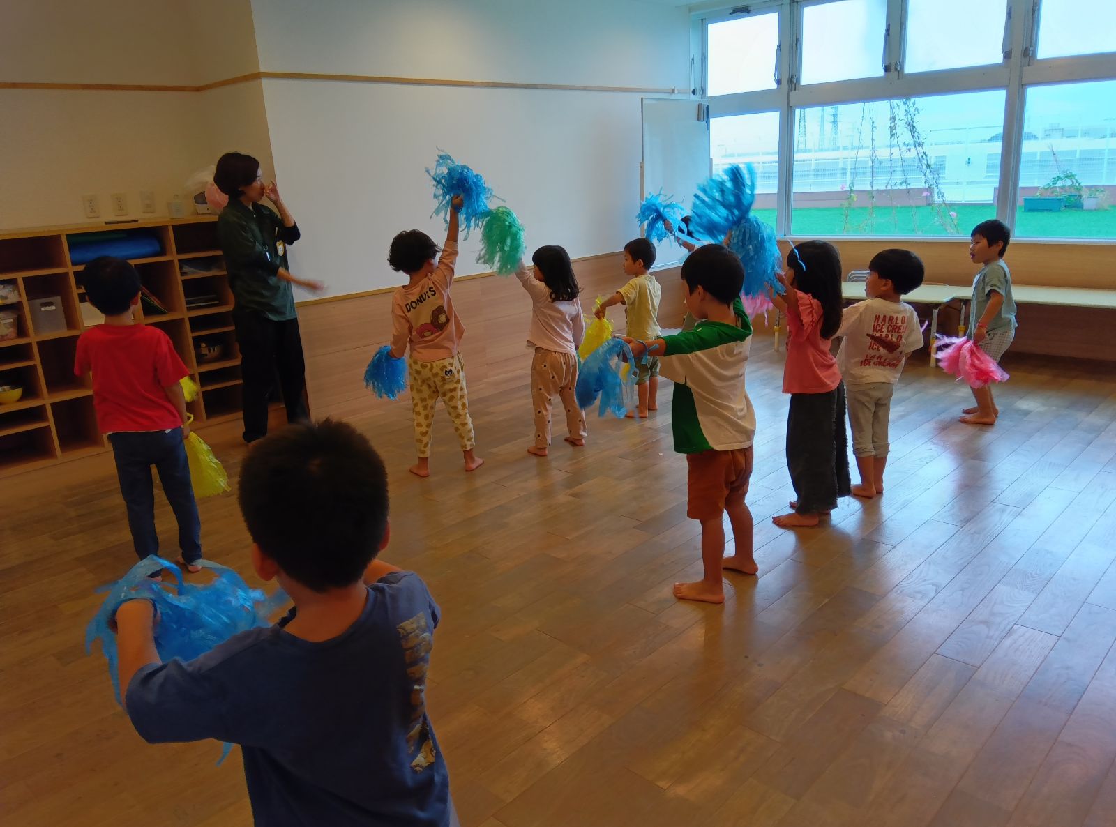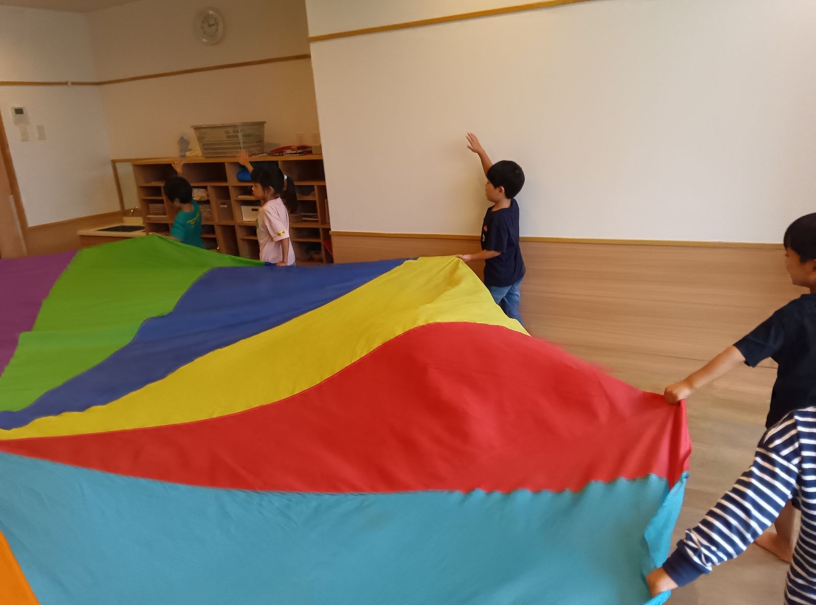 この日も一日雨の予報で園庭はびっしょりですが、子どもたちと話し合い、部屋の中でダンスとパラバルーンをして楽しむことにしました。