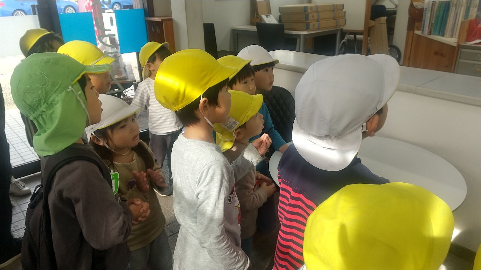 この日は、子どもたちと一緒に地域の工務店「サカタホーム」へ商店街ツアーにでかけました。工務店では、どのような仕事をしているのかを教えてもらい、子どもたちも興味津々で耳を傾けていました。