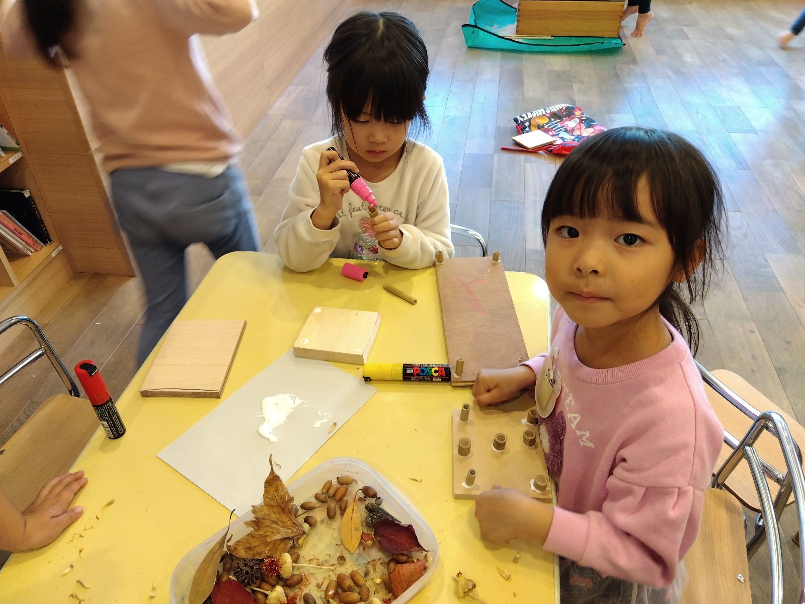 見学が終わった後は、工務店では、使われなかった木の端材をいただきました。後日、この端材を使って木工タイムを設け、思い思いの作品を作り上げました。