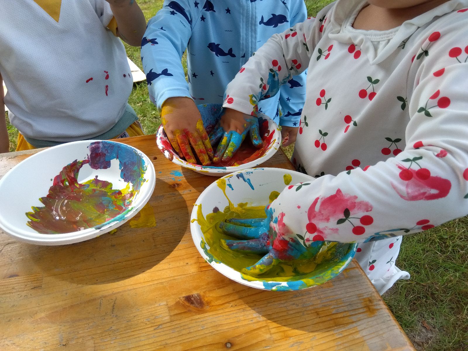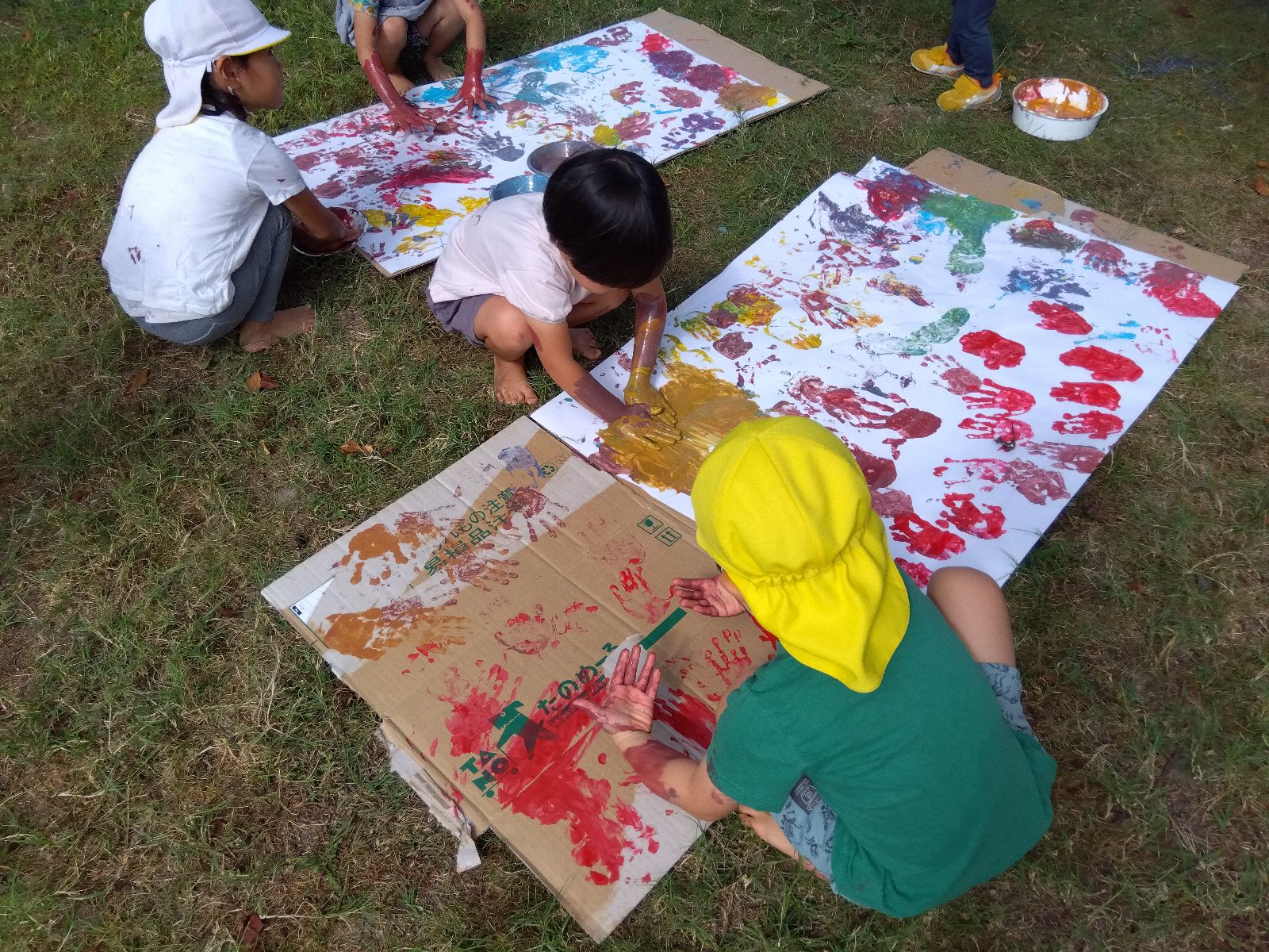 始めは、絵の具を触ったり、手や足につけることに抵抗がある子どももいましたが、徐々に慣れて楽しそうに遊ぶ姿が見られました。