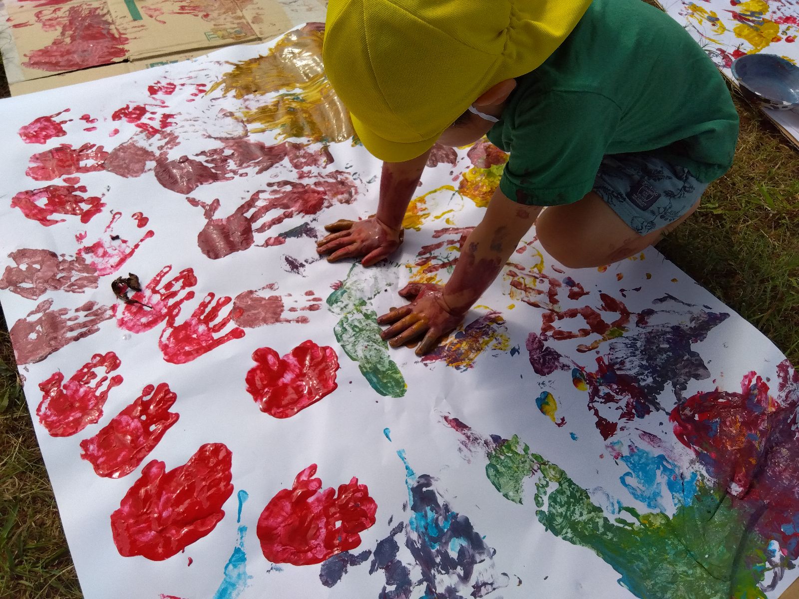 子どもたち同士の会話を楽しみながら、たくさんの色ができあがっていました。色が混ざり合い、カラフルになっていく手や足、模造紙に子どもたちは大興奮です。