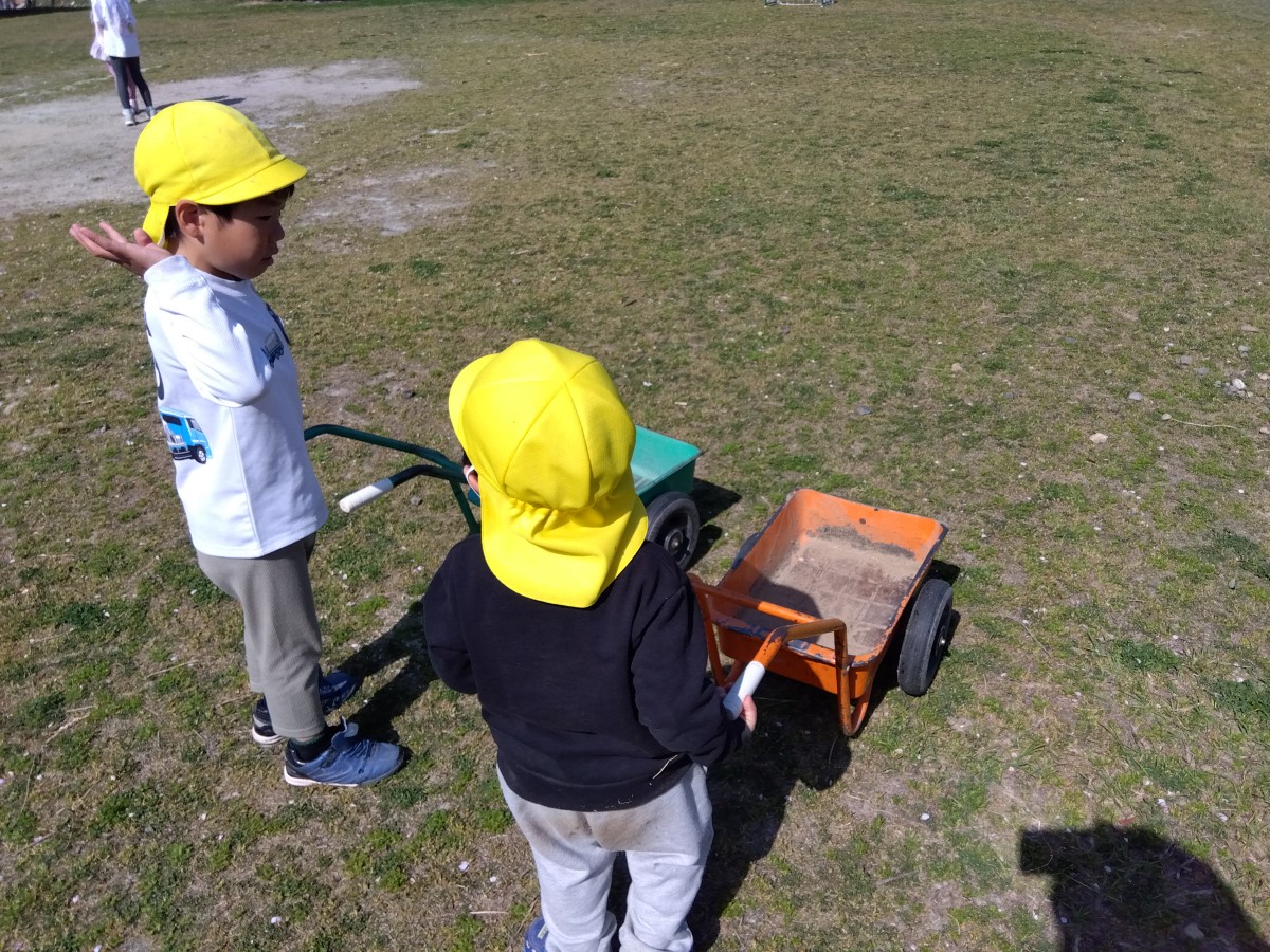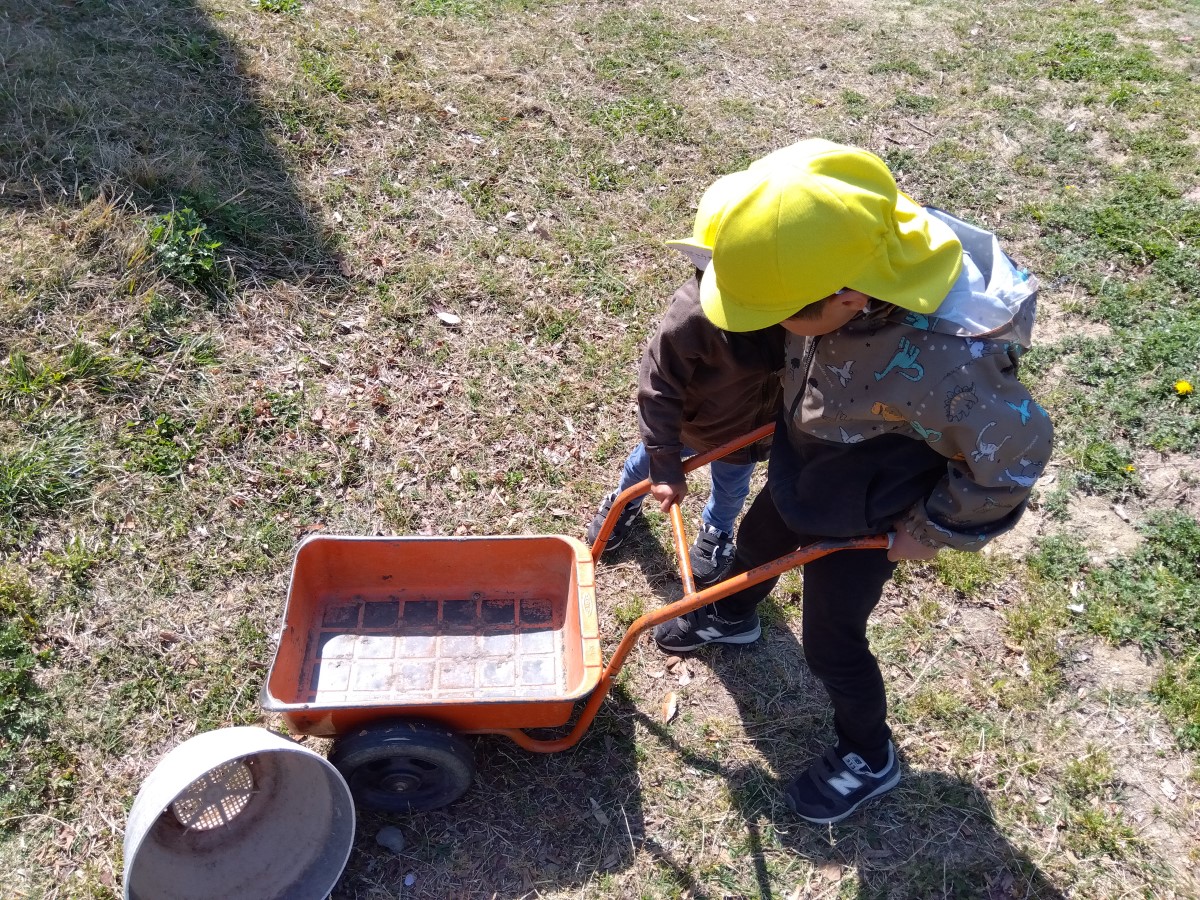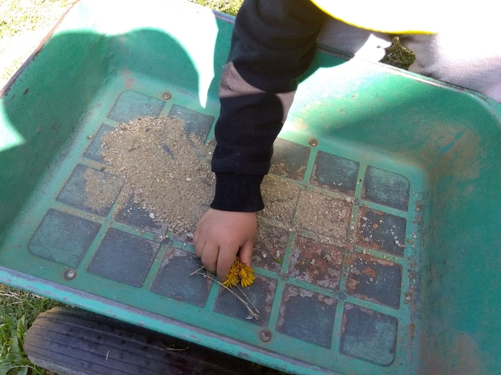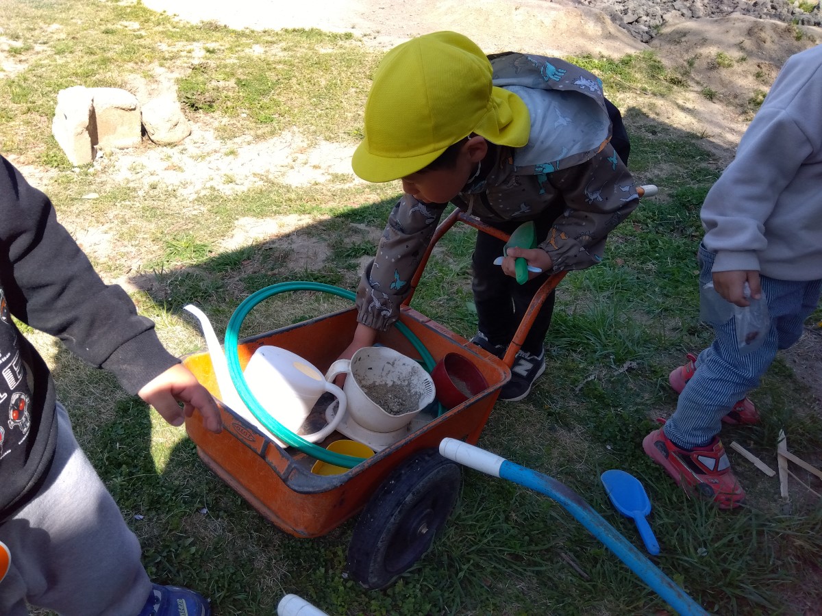 一輪車の遊び方は様々で、砂場セット、ボール、砂、石、虫、花などを入れて目的地まで運んでいます。