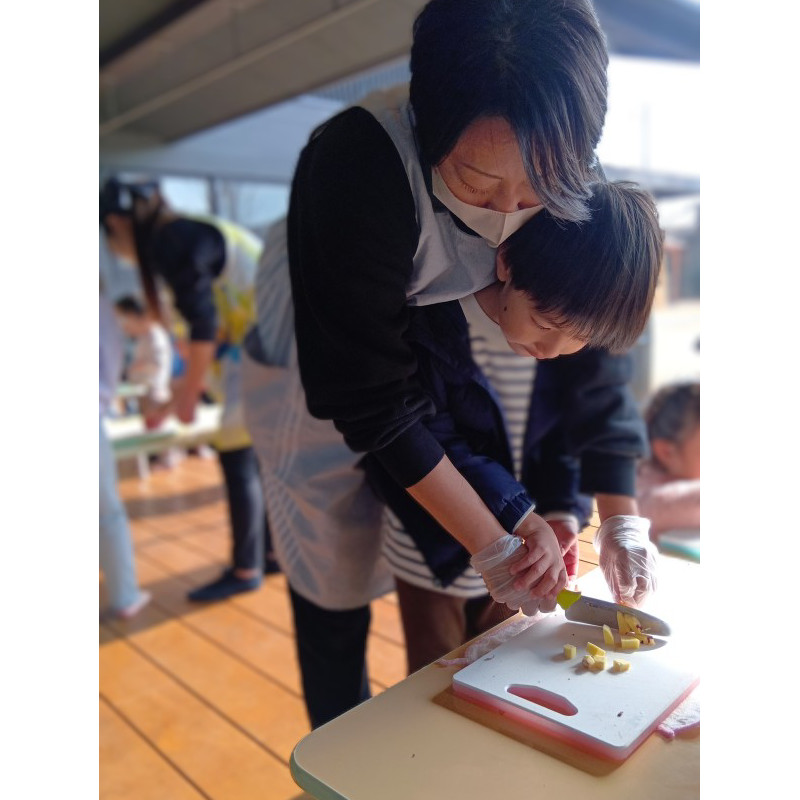 調理職員が包丁の使い方や切り方を説明すると真剣に話を聞き、見本通りに切れるよう慎重に包丁を握っていました。最後まで笑顔で野菜やキノコのカットを取り組む様子が印象的でした。