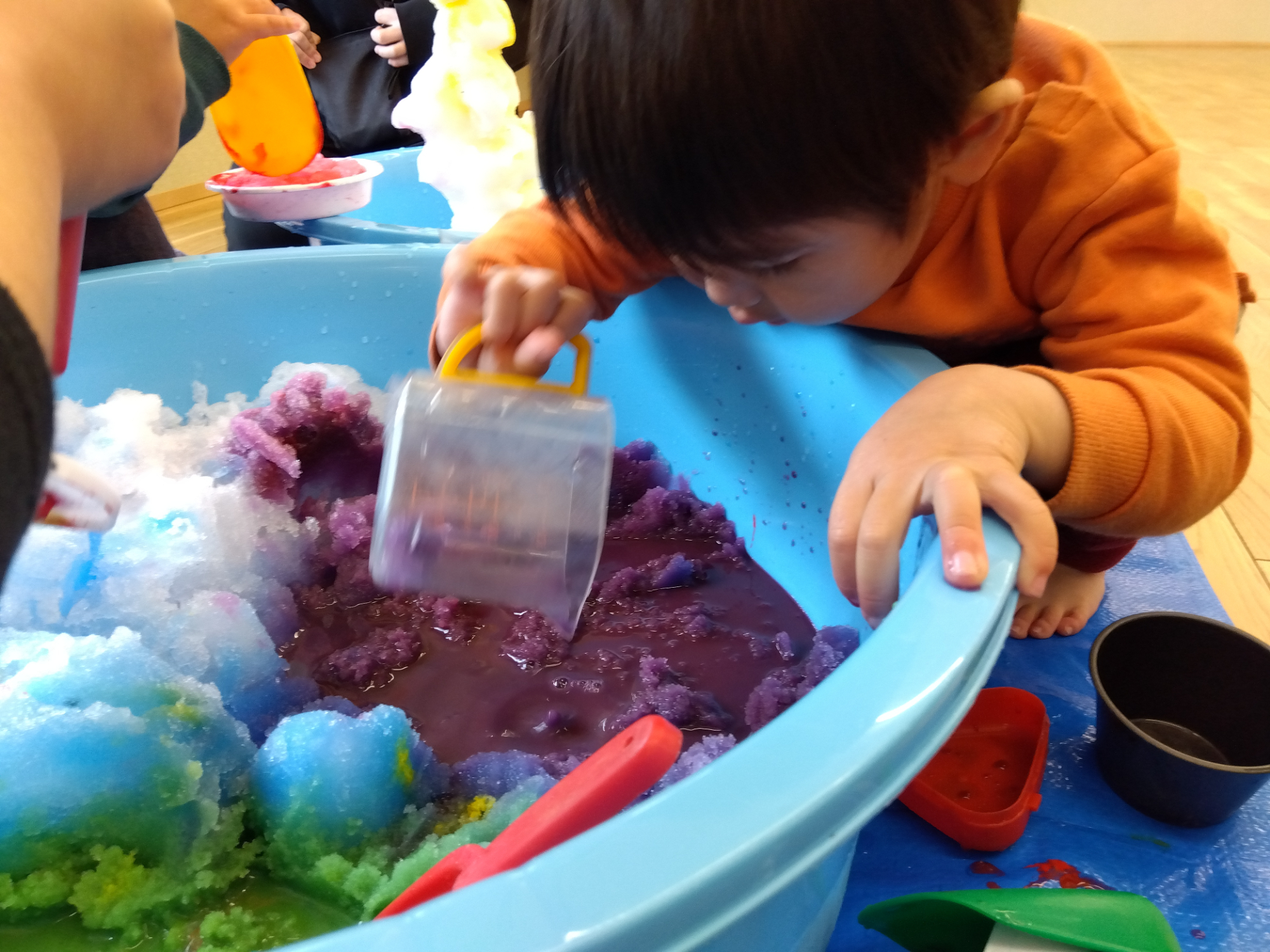 室内では、前日に用意したタライと、とってきた雪を入れて遊んでいると、寒さで外に行けなかった子が自然に輪の中に入って来る様子が見られました。雪でおにぎりや雪だるまを作ったり、スコップで雪をザクザクと掘ったり楽しんでいました。雪が顔にはねると「冷たい!」と驚いた表情をみんなに見せ、笑いが生まれていました。片付けの前のタライの雪に絵の具を垂らして色遊びも行いました。「黄色きれいだね」「紫になった」「こっち緑だ」などひとつの色を大事そうにスコップですくって観察したり、色を混ぜて変化を楽しんだりする姿が見られました。