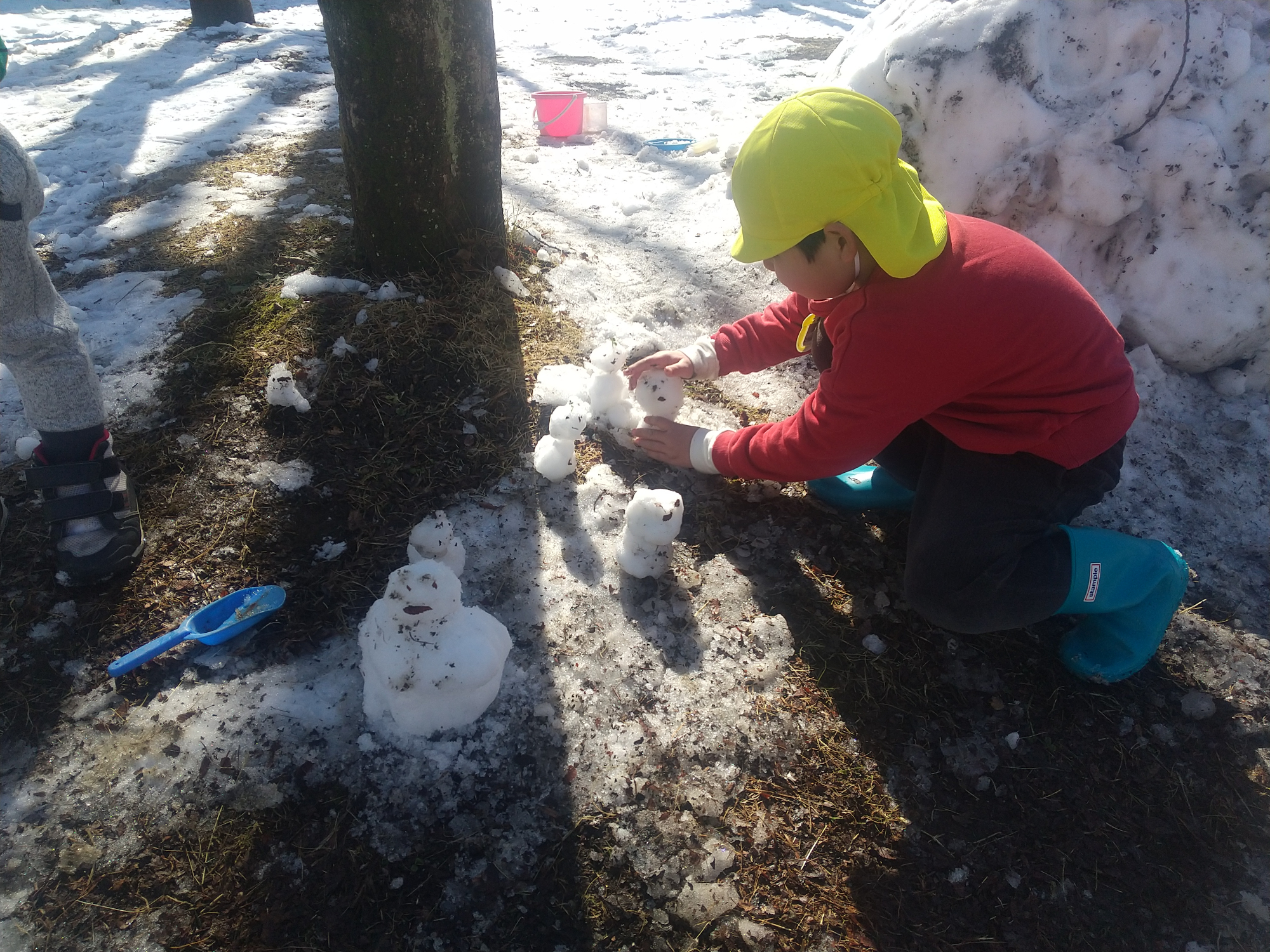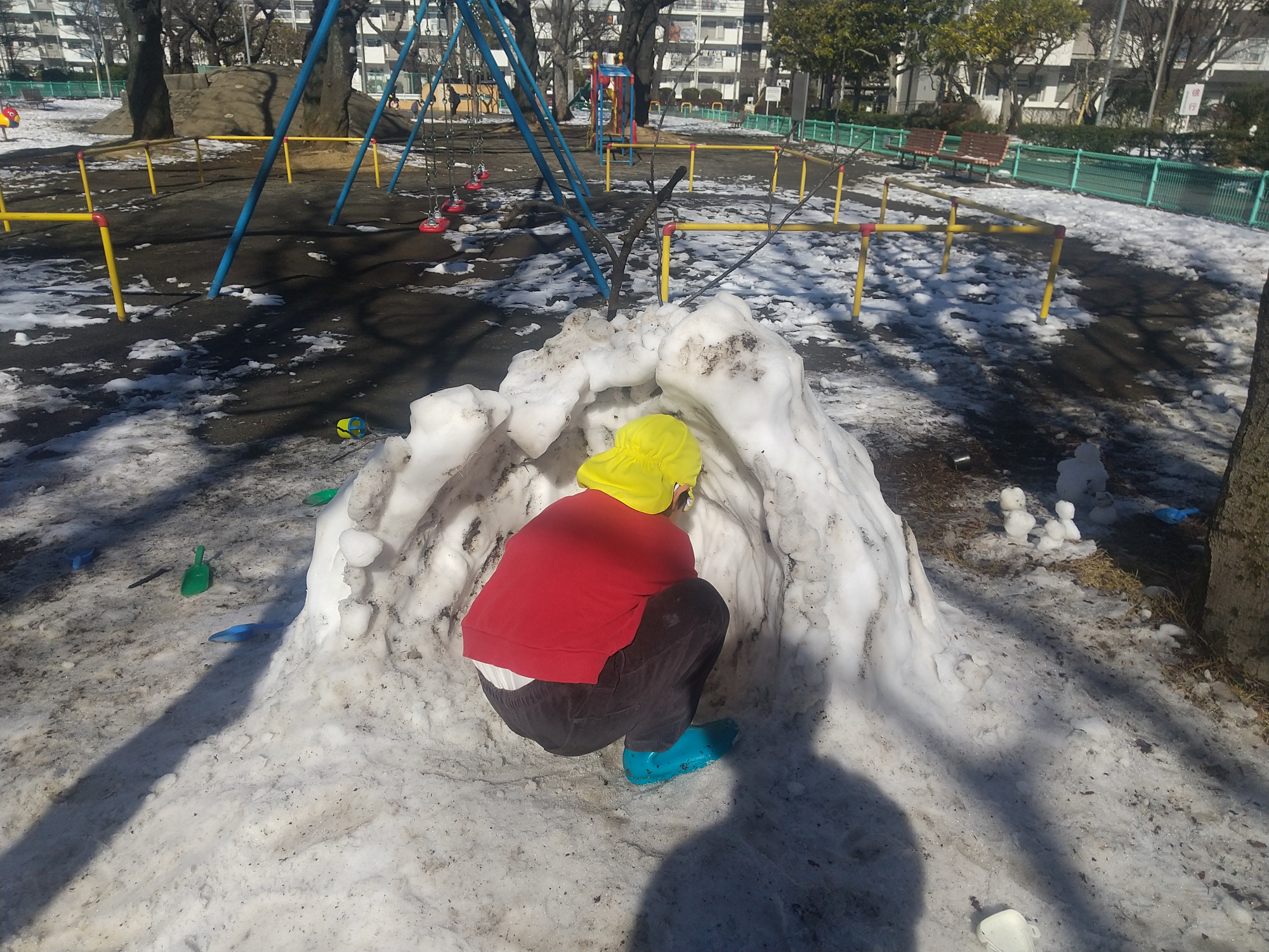 また別の日には、散歩中、足元が滑らないように注意深く歩いたり、雪山に上ってみたりしながら公園まで歩きます。普段は歩くことを嫌がる子も雪への好奇心で歩くことを楽しむことができました。公園では雪だるまを作ったり、かまくらに雪を足してみたりと普段はできない遊びをそれぞれが思い思いの感情を持ちながら一生懸命取り組んでいます。
