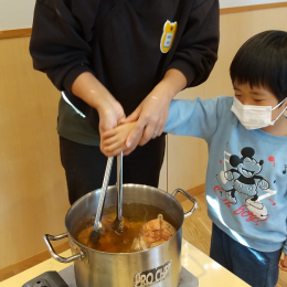 昼食までの時間はしゃぼん玉を追いかけたり、友達と肩を組みながら公園内の散策をしたり、自然の中で思い思いに過ごしました。たくさん遊んで、たくさん笑い、そろそろお腹が空いてきましたね。