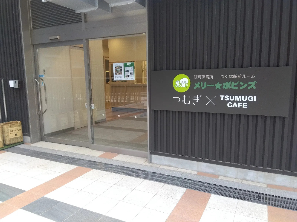 入口はこちらになります。メリー★ポピンズのマークが描かれた看板が目印です。トナリエつくばスクエアクレオ2階、正面のピアノが見えましたら右手に進んでいただくとメリー★ポピンズ つくば駅前ルーム、つむぎ つくば駅前ルームの入り口がございます。インターホンを押してお入りください。