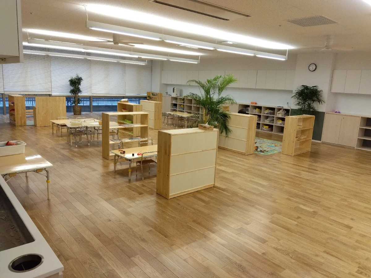 幼児室はより「ゾーン保育」を重視した環境になっております。「静」の活動に意欲的に取り組めるように、絵本のゾーン、制作のゾーン、ブロック遊び、電車遊びのゾーン、粘土遊びのゾーンを作っています。また、「動」の活動をして室内でも身体を思い切り使うことができるように、すべり台、鉄棒、マット運動、飛び箱などを配置するスペースを作ることで、静と動でバランスのよい発達を促しています。