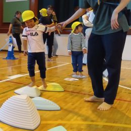 「だるまさんが」の絵本を読んだ後、親子でできる「ひざのせ遊びのだるまさん」を紹介しました。画面越しに見えたご家族との触れ合いはとても微笑ましい姿でした。