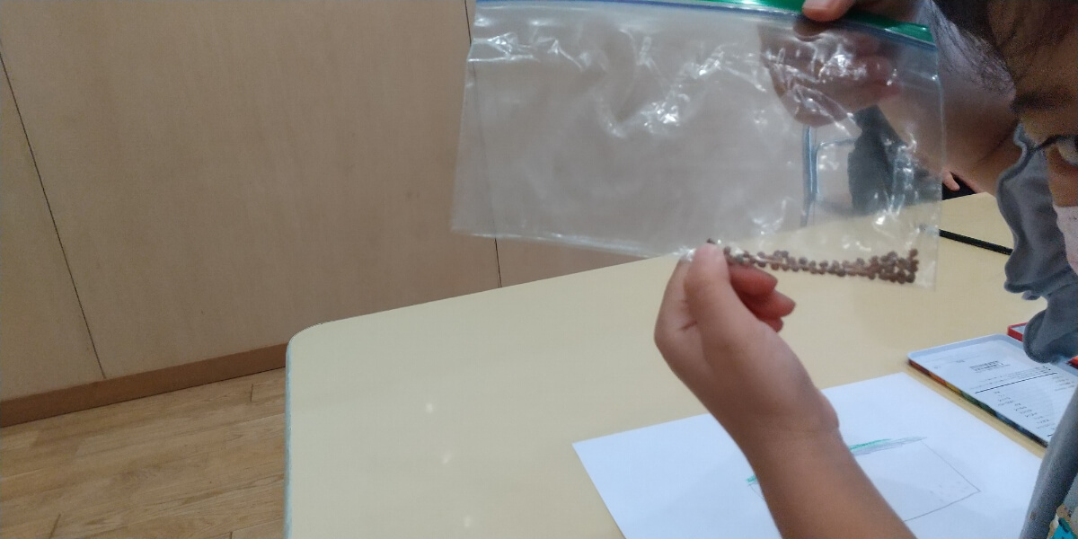 まず、みんなで種の観察をしました。ひとつひとつ見比べたり、匂いを嗅いだり、スケッチをしてみたりと思い思いに観察していました。