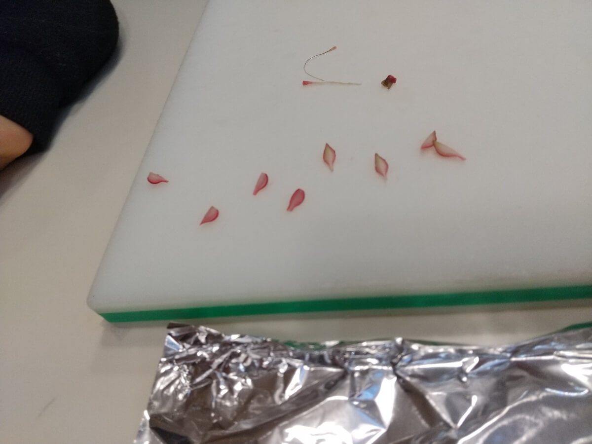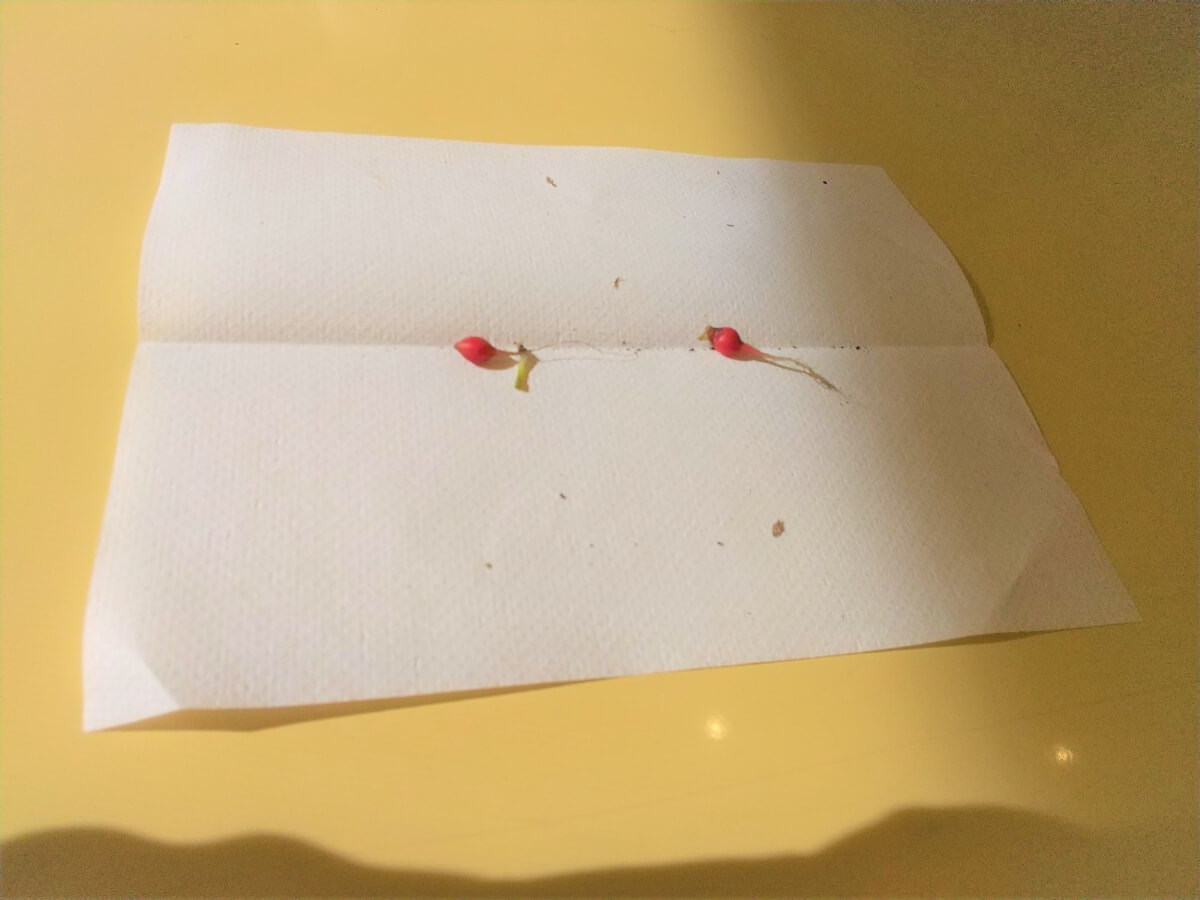 「なにかできてる!」「これ、なんだろう?」「ちいさいあかかぶじゃない?」「だいこんのにおいがする!」様々な意見がとびだしました。種の正体は「はつか大根」でした。