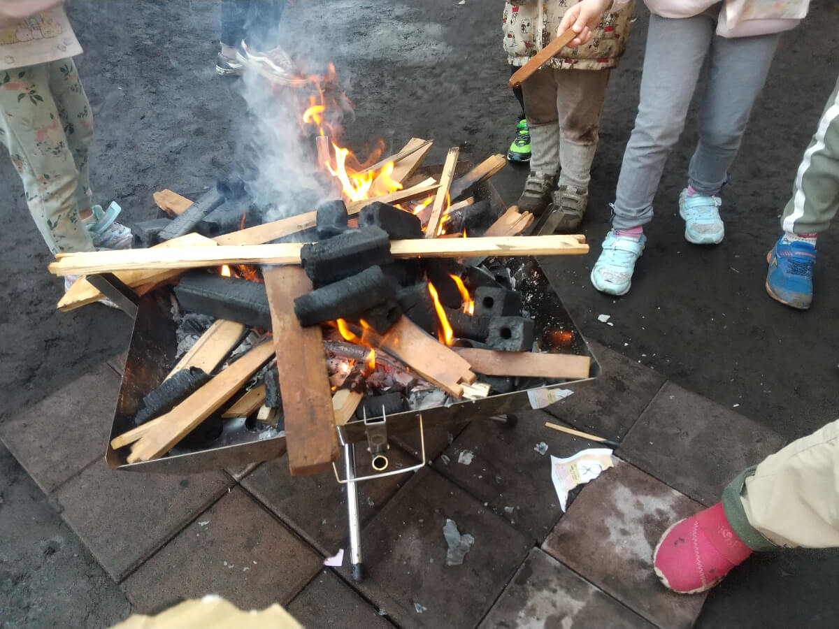 つつじヶ丘どろんこ保育園・発達支援つむぎ つつじヶ丘ルームでは、原体験の一つとして本物の「火」に触れる経験ができるよう、たき火で焼いて食べる機会がたくさんあります。