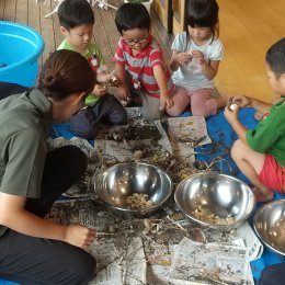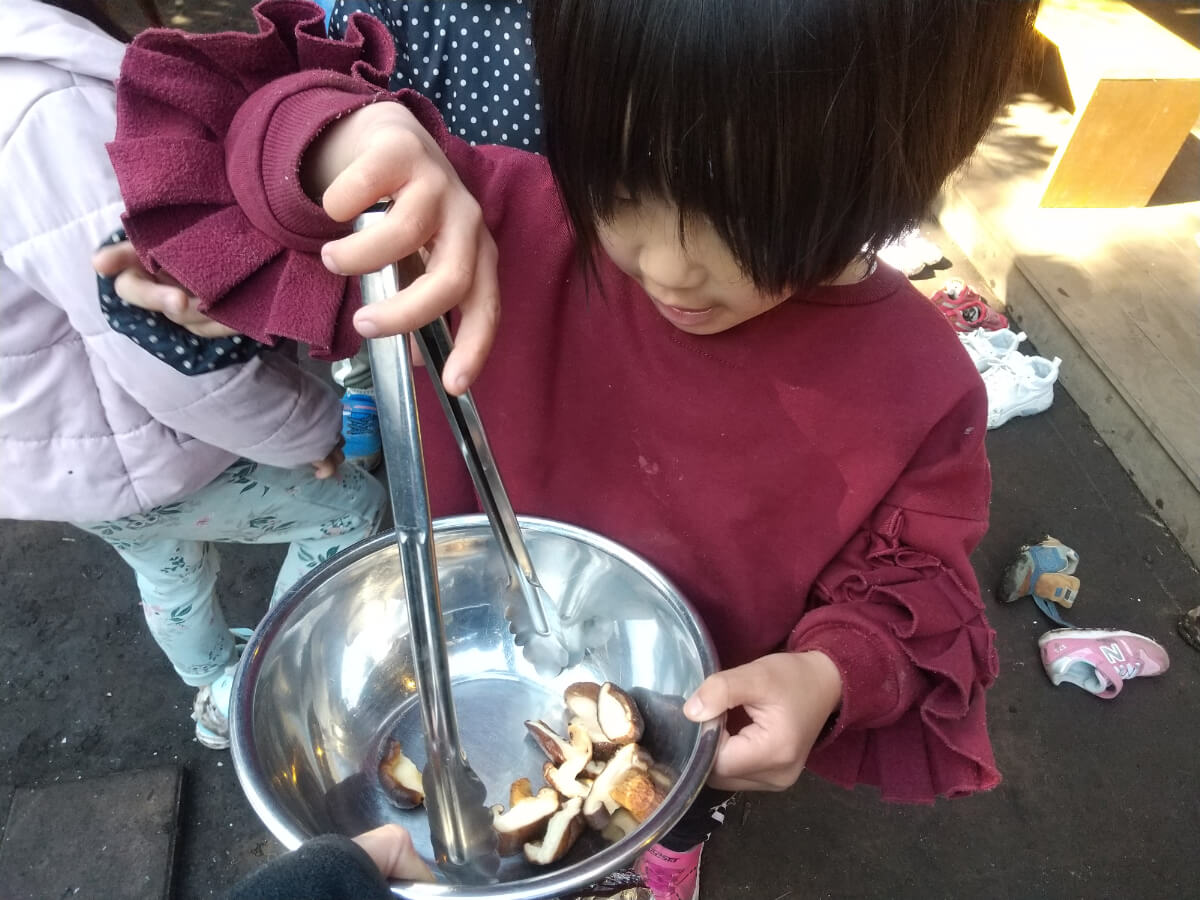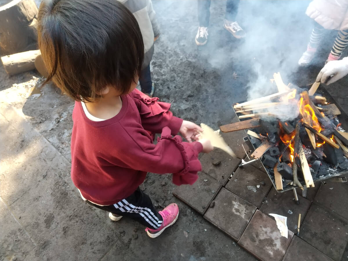 焼けたしいたけに醬油をぬると、香ばしい匂いが漂っていました。Mちゃんは、周りの子がやっていることを見て、同じように火の番をしたり、しいたけを焼いたりと、友だちと一緒にたき火を体験することができました。たき火のパチパチという音を聞いたり、煙の臭いがすると「くさい」と鼻をつまんだり、火の温かさを感じて手を温めていたりと、ホンモノの「火」を五感で感じ取っていました。