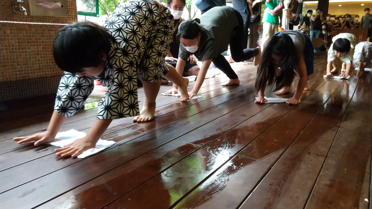 いよいよ当日がやってきました。どろんこ祭りでは、雑巾がけレースのイベントが行われました。 雑巾がけレースでは、曲がりながら進む子、ゆっくり進む子など、それぞれの子どもたちのペースで雑巾がけをします。 見ていた人たちは、最後の子がゴールするまで温かい雰囲気で「がんばって!」と応援しています。 レースを終えた子には、完走記念の手作りのバッジが配られました。嬉しかったのか、保護者の所へすぐに走って行き、見せようとする姿がありました。
