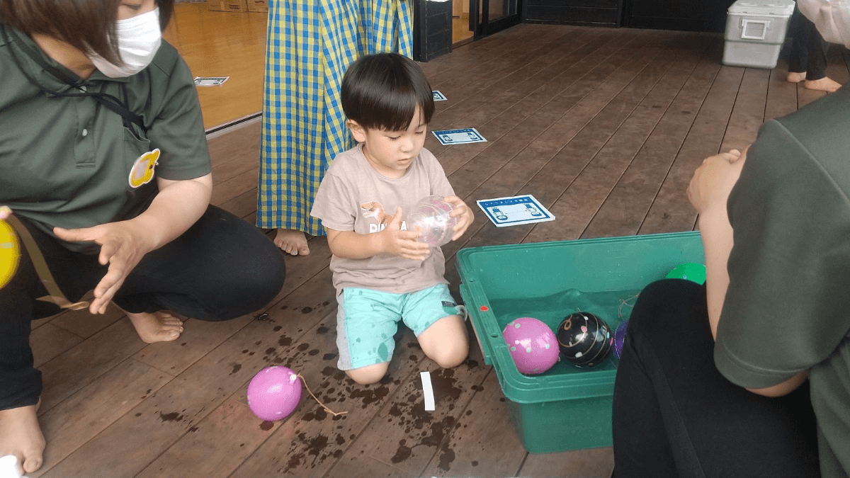 ヨーヨー釣りコーナーでは、スタッフが子どもに「どれが好きかな」と言葉をかけると、ヨーヨーに近づき、風船の色や、中に入った水の感覚を確かめながら、触りました。どのヨーヨーも魅力的だったのか、繰り返し触っている姿が印象的でした。