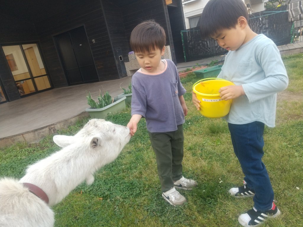 活動中、「やぎさんにごはんあげたい!」と子どもたちの方から声掛けがありました。その思いをグループ内で共有し、一緒に餌やりをしています。餌用バケツを持ってみらいちゃんの元へ向かいましたが、バケツが一つしかないため最初は取り合いになりました。取り合いになることも関わりの一つですが、スタッフが様子を見ながら少しだけ仲立ちをします。「順番にバケツ持とうか」と一言伝えると、「そうだね、じゅんばん!」「キャベツ、一個ちょうだい」と会話が進みました。ミライちゃんも喜んで食べていましたよ。