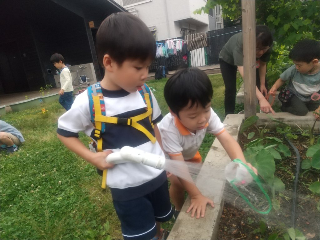 雨天時の支援で作ったオリジナルのペットボトルじょうろを手にし、喜んで水やりをしました。最初はそれぞれが場所で自由に水やりをしていましたが、誰かがシャワーホースを手にすると、他の子も「ぼくもみずほしい」と言葉で伝える様子が見られました。すると、「いいよ、まっててね」と言いながら友だちのじょうろに向けて水を入れてあげ、一緒に水やりが始まりました。「自分でできることは自分でする」「すべての人との関わりから、判断・行動を身につける」。つむぎの子どもたちも協力しながら日々畑仕事を頑張っています。