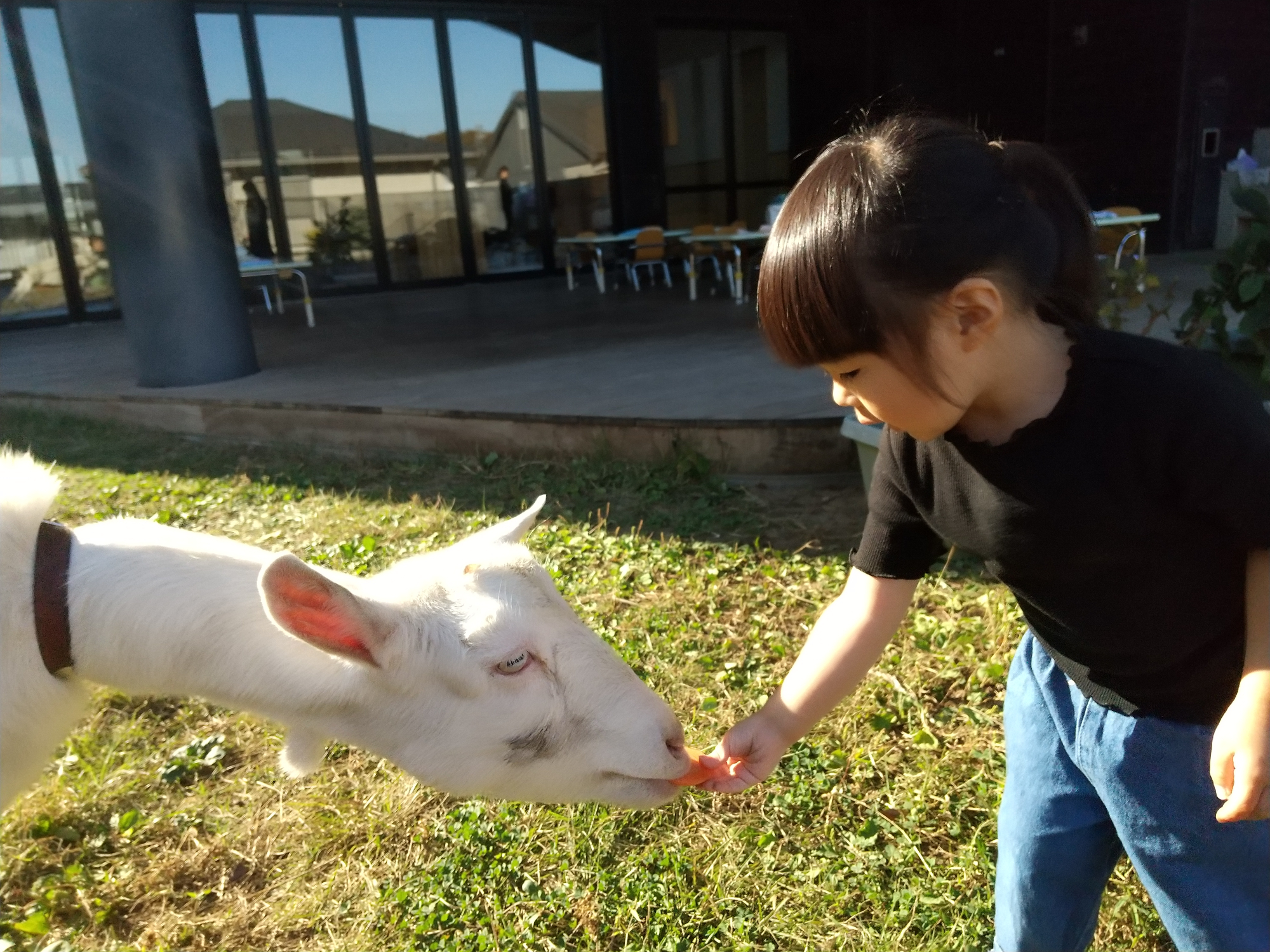 発達支援つむぎ つつじヶ丘ルームには、日が差し込む明るいテラスの畑に野菜や花々が咲き、広々とした園庭にはヤギの「みらいちゃん」が過ごしています。子どもたちが来所する時には、いつもみらいちゃんがお出迎えをしてくれます。親子グループに参加している2歳児の子どもたちは、ヤギに興味を示すものの、怖くて大人の後ろに隠れながら観ていたり、餌をあげようとしても近寄れないでいたりしたのが春頃の姿でした。それから秋になり、大人がみらいちゃんに、楽しく餌をあげている姿を見てきた子どもたちは「自分でもやってみたい!」と思う気持ちが大きくなったのか、一人で大人と一緒に餌をあげられることに挑戦することが増えました。そして今では、園庭に生えている雑草を摘んで、一人でみらいちゃんに近寄り、餌をあげられるようになりました。