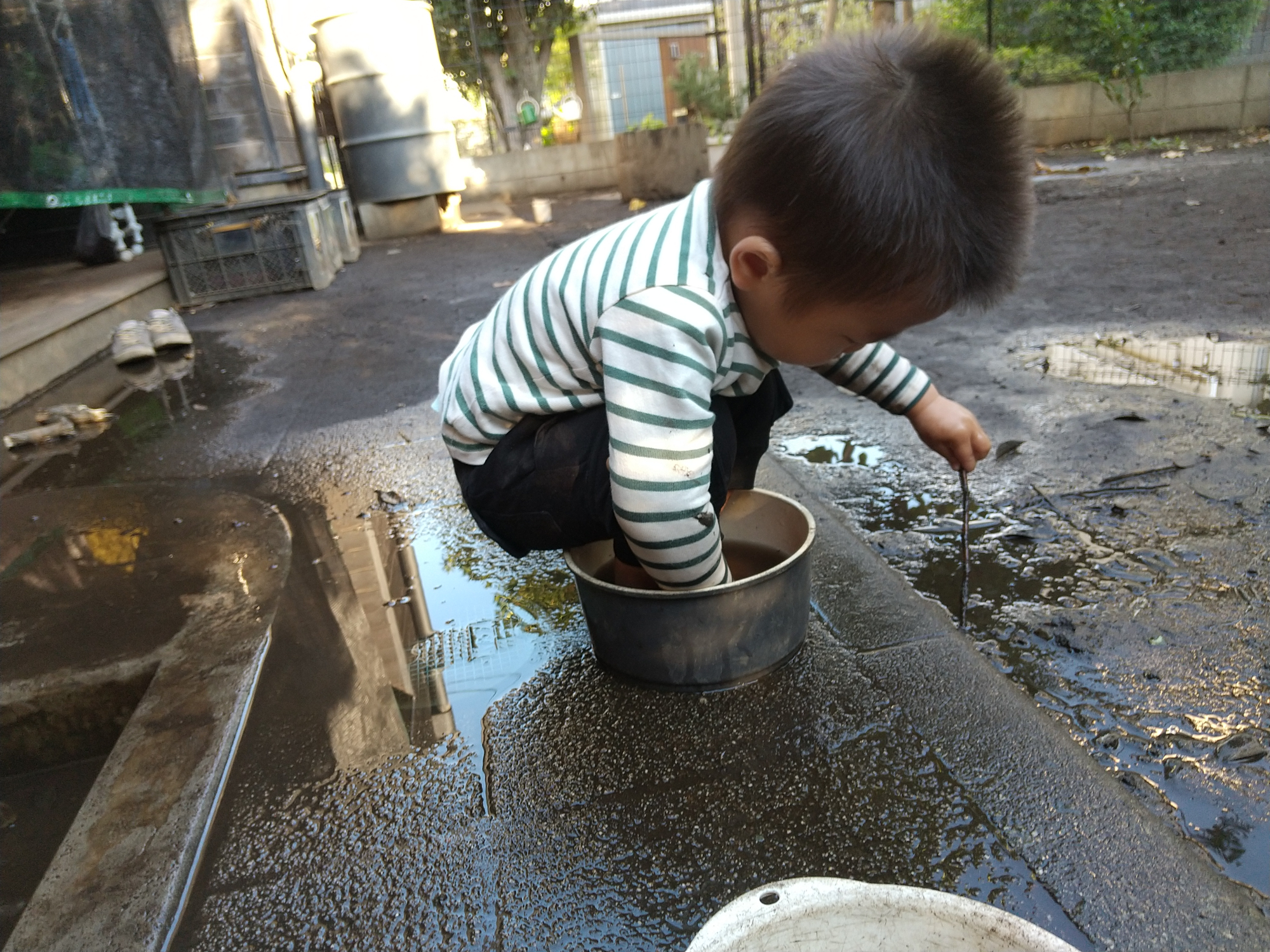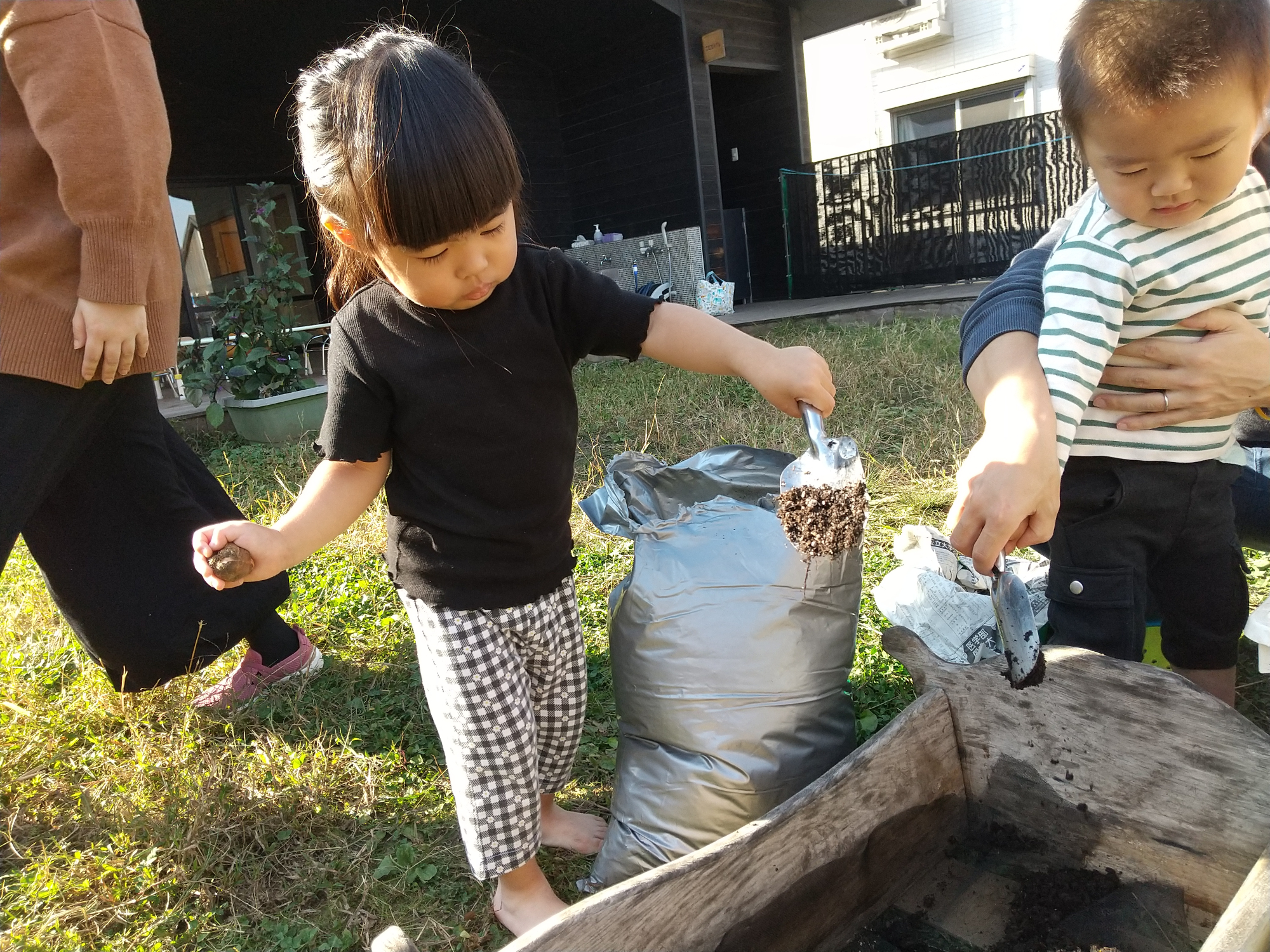 畑では夏の花は終わり、次の季節への移り変わりとしてチューリップの球根植えをするため、土づくりから始めました。普段から大人と一緒に裸足で泥遊びをしていることもあり、(裸足で遊ぶのが通常になっていて、園庭で遊ぶ時も靴を履くことを拒むほど)、コンポストの土や肥料、花壇用の土をスコップで躊躇うことなく花壇に入れていきます。大人が素手で土を平らにならすと、子どもたちも真似て素手で平らにきれいにならしていました。