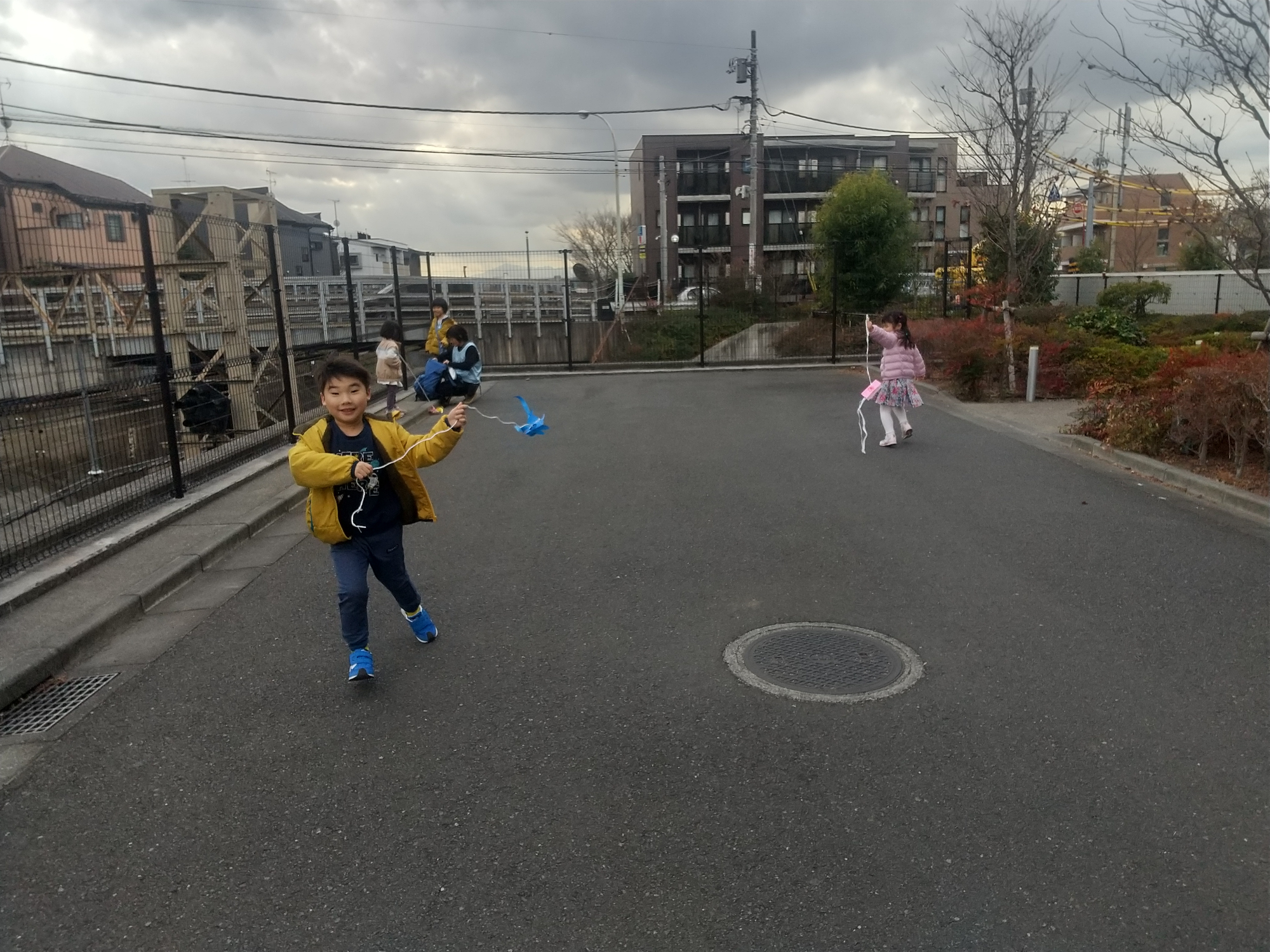 自分で制作した凧を揚げながら思い切り走って体を動かしたり、友だちと競争したりとそれぞれの過ごし方で楽しむ姿が見られました。次回はたくさん走れる場所まで散歩にでかけ、凧揚げをしようと子どもたちと約束をしました。