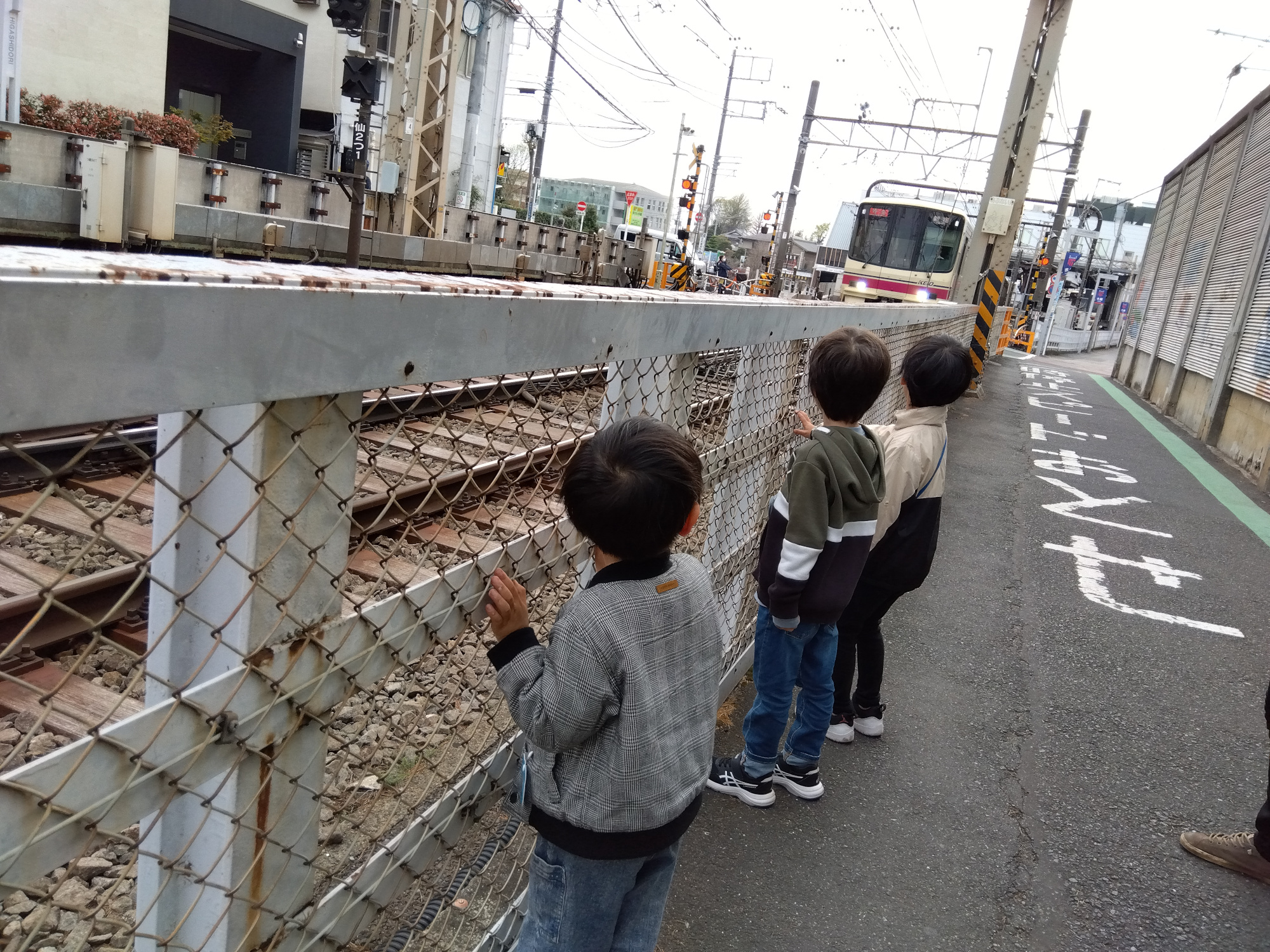 「早い!風がすごいね」とあまりの迫力にみんな大興奮。「左かな、右かな」と電車が来る方向を予測したり、「僕は京王ライナーに乗ったことあるよ」「この前電車に乗って競馬場に行ったよ」などと、電車から話題を広げてやりとりする姿がみられました。