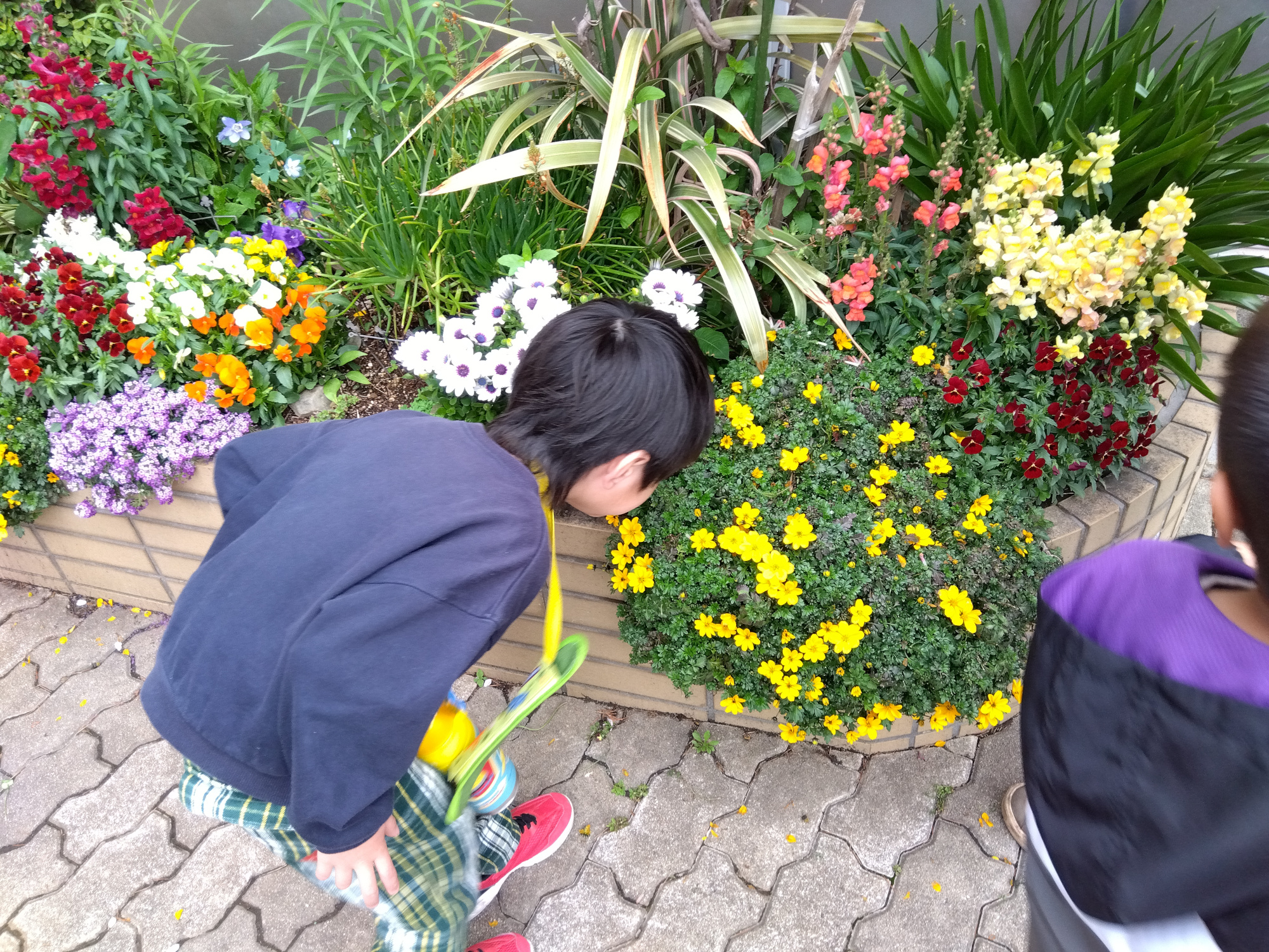 植物が好きなAくん、近隣の小学校の花壇を見つけると、事前の約束を守って花には触れず、香りを嗅ぎます。「これ、僕が好きな匂い!この花はあまり匂いがしないよ」と教えてくれ、それを聞いた友だちも香りを嗅ぎ、感想を伝え合いました。