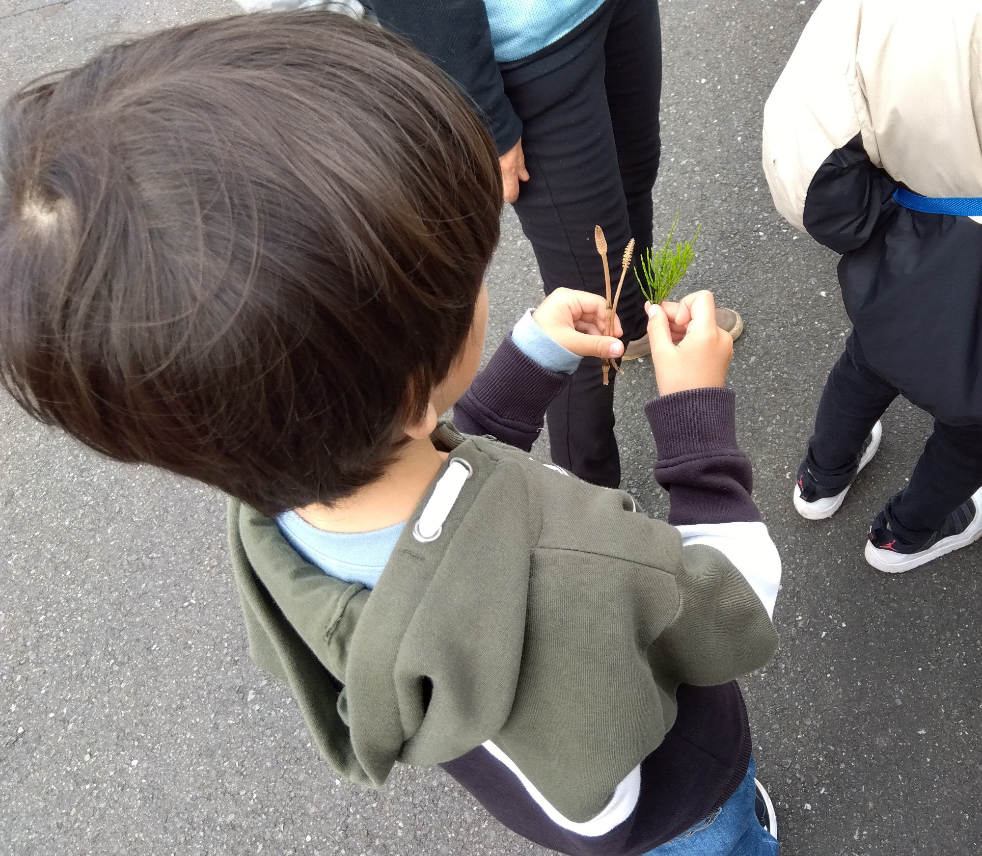 道の途中で今度はKくんが「桜が咲いているよ、かわいいね」「つくしだ!すぎなもあるよ」などと教えてくれます。スタッフもすぎなを知っているとは思わずびっくり!それを聞いた友だちが「僕もほしい」と集まり、数を決めてみんなで摘み取りました。帰り道は様々な植物クイズをしたり、子どもたち自ら「チューリップ」などを歌ったりしながら帰りました。保護者がお迎えに来てくださると「見て見て!」と嬉しそうにつくしを見せる姿が印象的でした。
