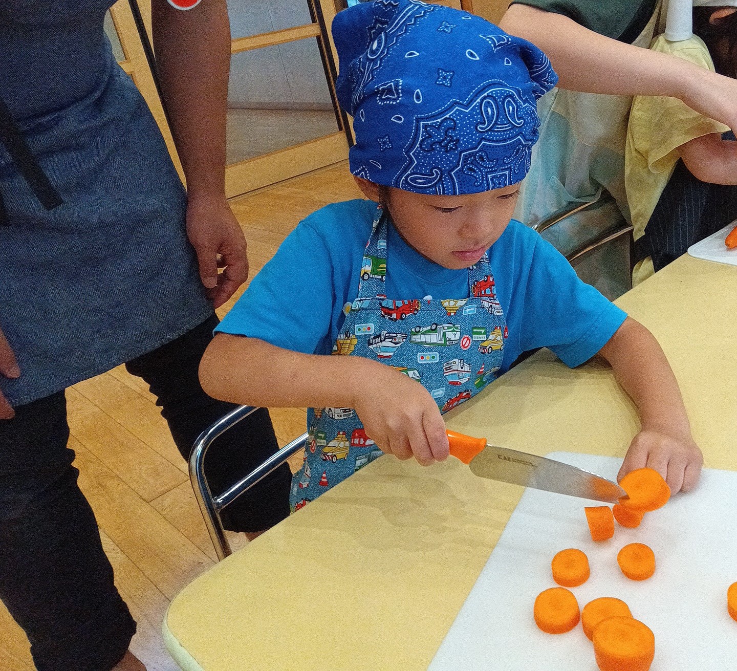 どのように調理を行うか、みんな真剣にスタッフの話を聞いています。実際に調理をしてみると、育てた野菜について「種があるよ」「中身が〇色だよ」と自分で見て感じたことを共有しあう姿がありました。少しずつ収穫した野菜がいつも見慣れている料理に変わっていくこと姿を見ながら、食べたそうに覗いています。