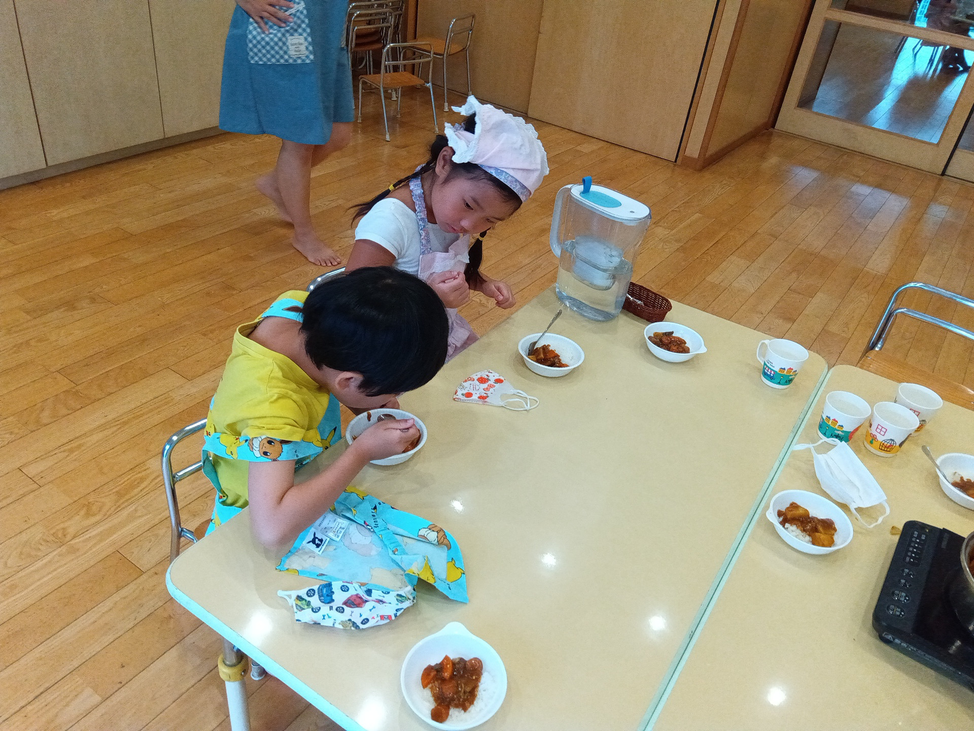 今回は収穫した野菜で ①野菜ジュース ②夏野菜カレー の2つの活動に分けて調理活動を行い、それぞれ夏野菜の調理を楽しみました。