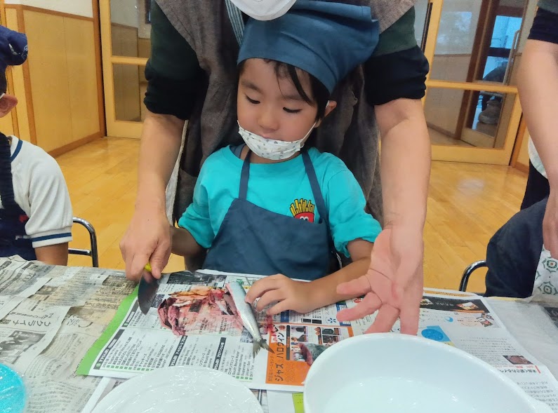普段、食事をするときにはすでに魚は捌かれているものが多いため、「どうやって自分たちが食べるときの姿になるのかな?」「魚は切ったら血が出るのかな?」「どんな感触なのだろう?」など色々なことを、魚を捌く前に考えました。