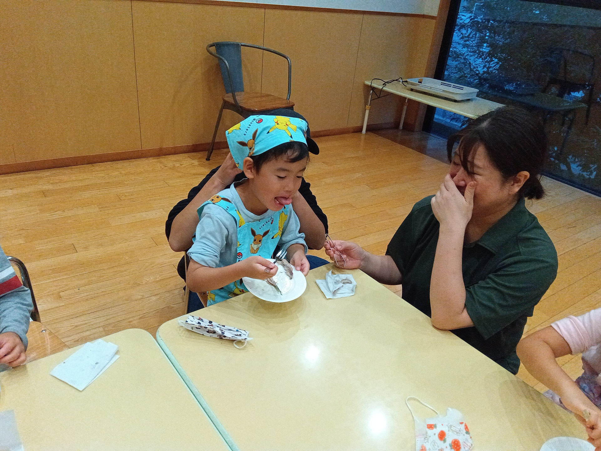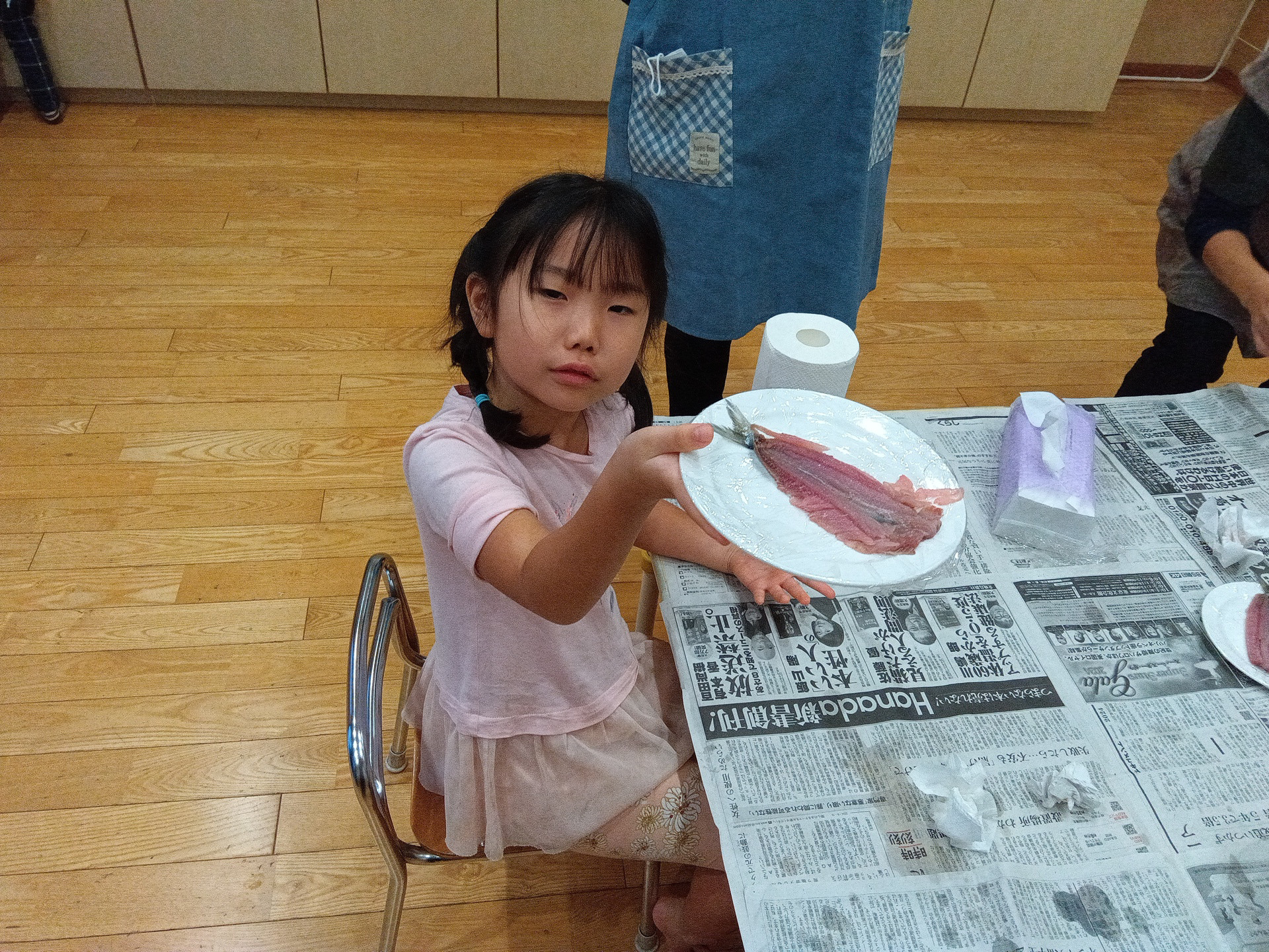 自分でさばいたイワシの味は格別!小骨が気になって食べにくそうにしている子もいましたが、ほとんどの子が完食することができました。頑張って開き焼いた魚は、保護者様にも見ていただき、一緒に食べてもらいました。