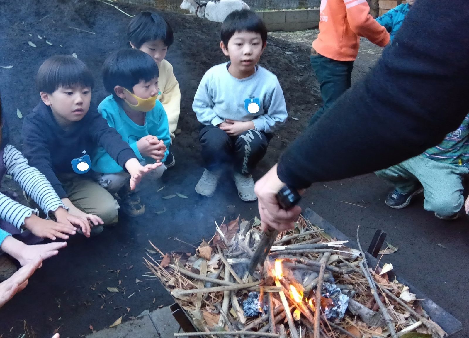 いよいよ着火の瞬間、麻紐の着火剤から木に火が燃え広がると「おおー!」と声が上がります。始めは小さかった火が、みんなで息を吹きかけることでどんどん大きくなりました。火の勢いが増してくると「あったかいよ!」と火の温かさに気づき、みんなで火に手をかざします。