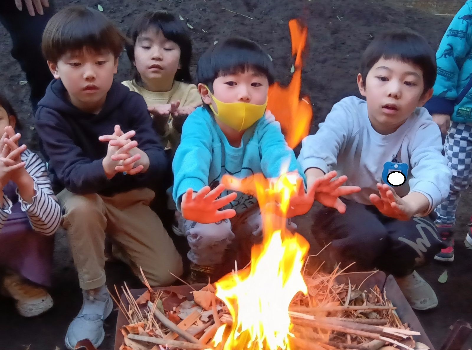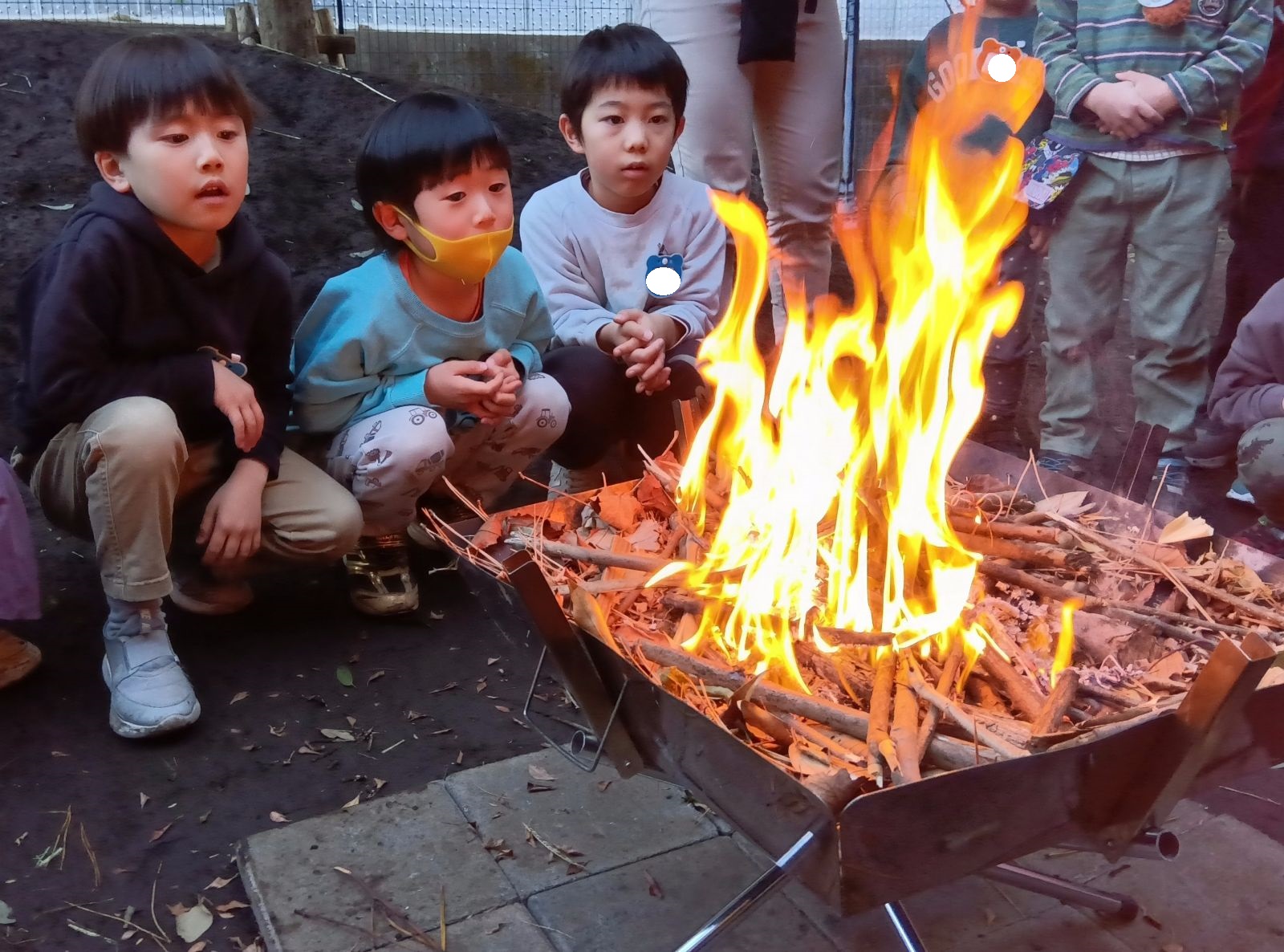 手を近づけすぎると「危ないよ」と声を掛け合う姿も見られました。煙が出たり、大きくなったり小さくなったりする炎に夢中になる子どもたち。「火の色が変わってる」、「パチパチって音がするよ」と様々な感想を伝えあっていました。