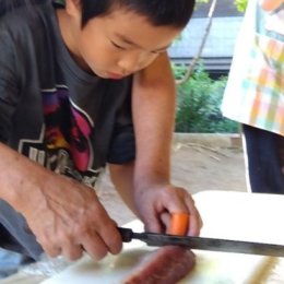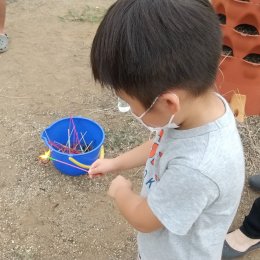 4月中に近隣のホームセンターにて、保育者と子どもたちが共に選んで苗を買い、5月中に同じ市内にある君津高校の園芸科の高校生と先生に来ていただき、一緒に畝づくりをし、野菜の苗を植えました。子どもたちは高校生たちに「土のところを優しく持ってね」、「穴を掘ったところに苗を入れるんだよ」と苗の持ち方から植え方まで丁寧に教えてもらい、畑にはジャガイモ、ピーマン、ラディッシュ、トマト、ナスとたくさんの野菜が植わりました。