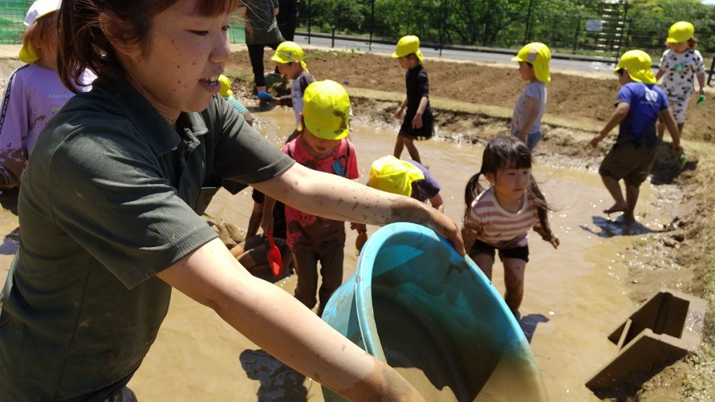 子どもたちは泥だらけになりながら田んぼの中の土を細かく砕いていました。田んぼ内の水をかけあって遊び、充実した日となりました。