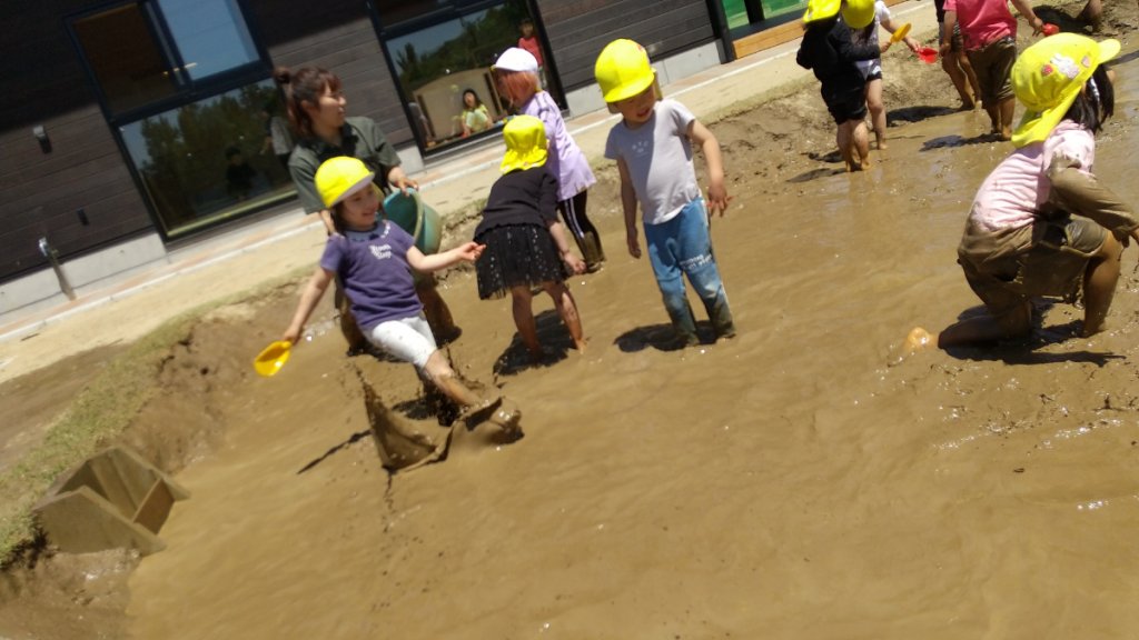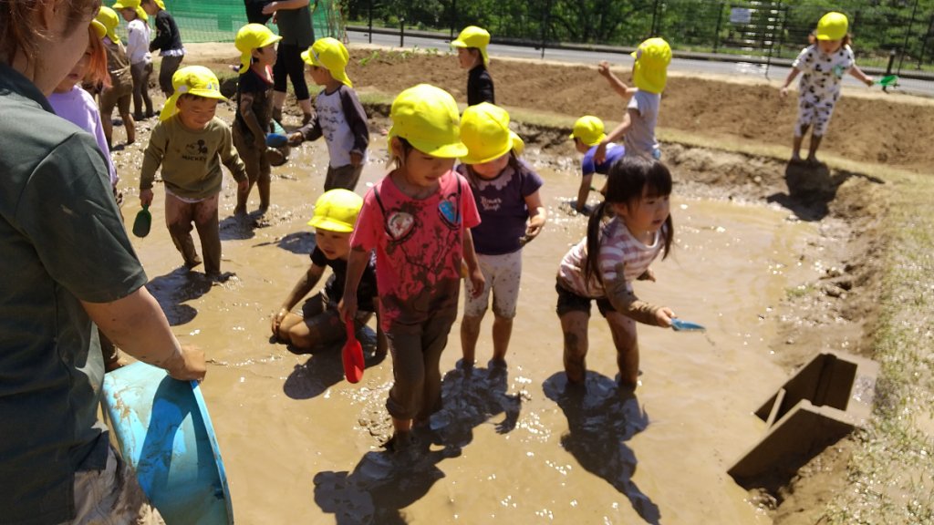 初めての田んぼを目にして、ジャンプし田んぼに入る子どもや慎重に入る子どもなど様々な姿がありました。また泥に触れる中で土の感触を楽しむ子、苦手な子などたくさんの表情を見ることができました。泥遊びが苦手な子は2階のテラスから雰囲気を楽しみました。
