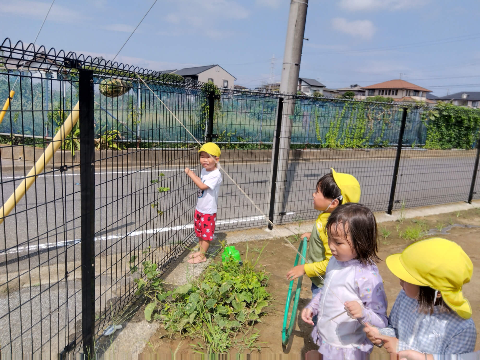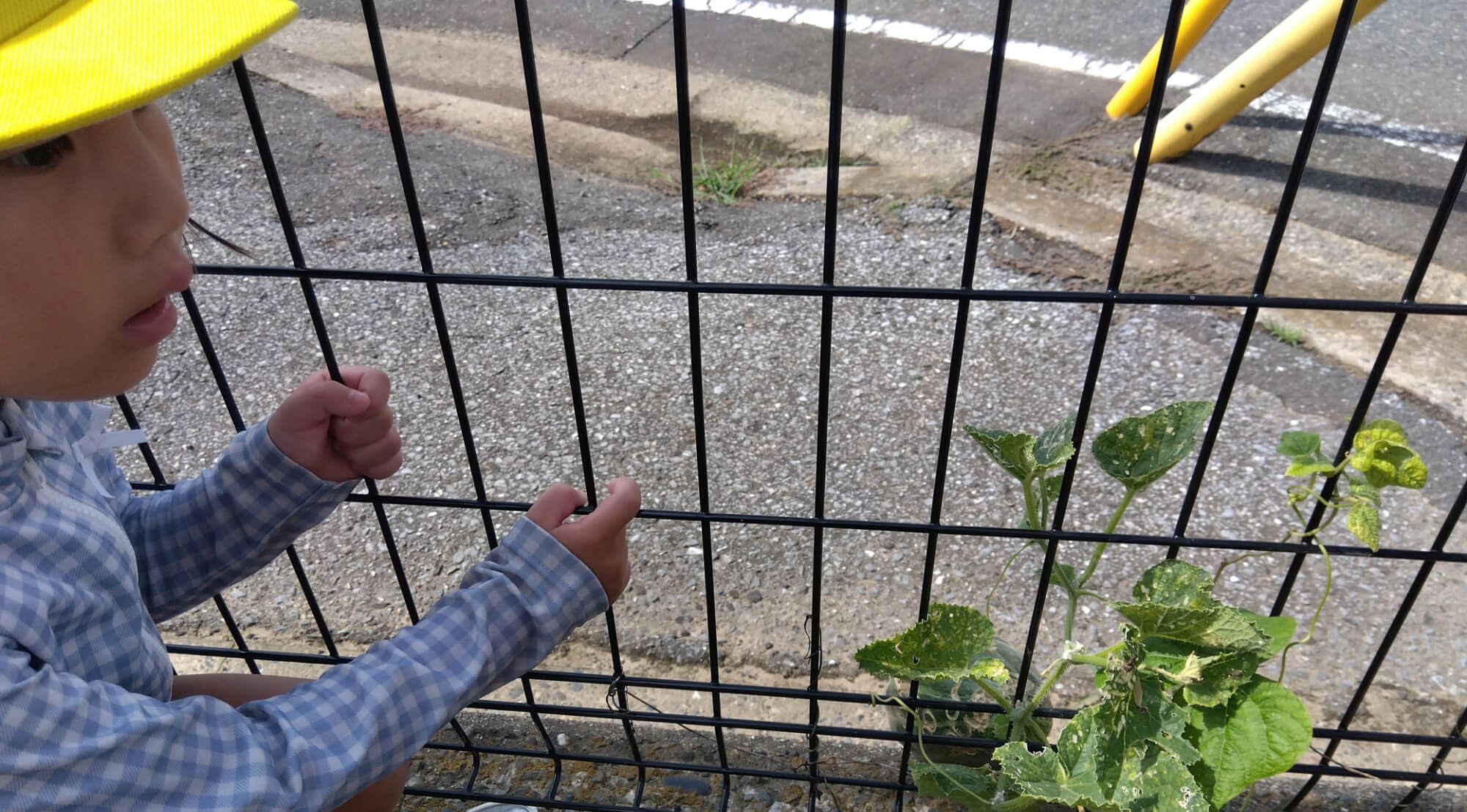 夏野菜の収穫が終わりに近づいてきたある日、フェンス越しに植えた瓜が大きな実を付けていることにAちゃんが気づきました。「みて!大きな野菜ができてるよ」と近くの友達に伝えます。「取りたいね!食べてみたいね!」など会話が広がる中で、Bちゃんは瓜が園のフェンスの外に実を付けていることに気が付きました。