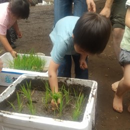 毎年行われる「どろんこ祭り」が終わったある日には、お祭りで使った太い竹や細い竹を保育者が用意すると、竹太鼓が始まりました。