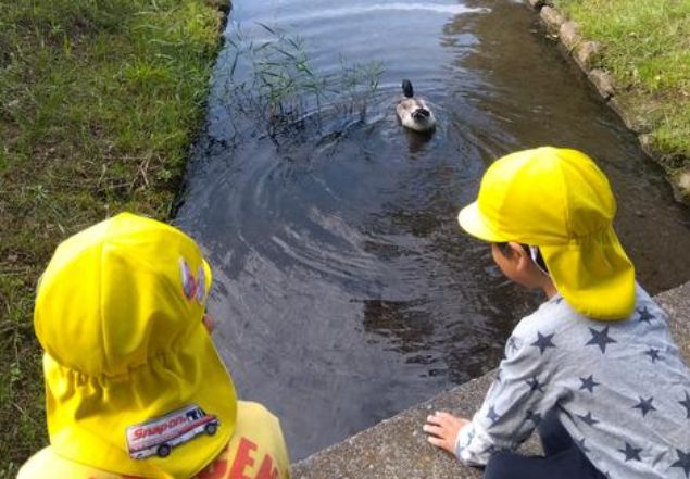 散歩道中で鴨を発見しました。「お尻フリフリしてて可愛いね」「どこに行くのかな?」「ご飯なに食べてるのかな?」とさまざまな声が聞かれました。 その後歩きながら鴨ごっこと称して、お尻をフリフリしながら歩く可愛い姿が見られました。