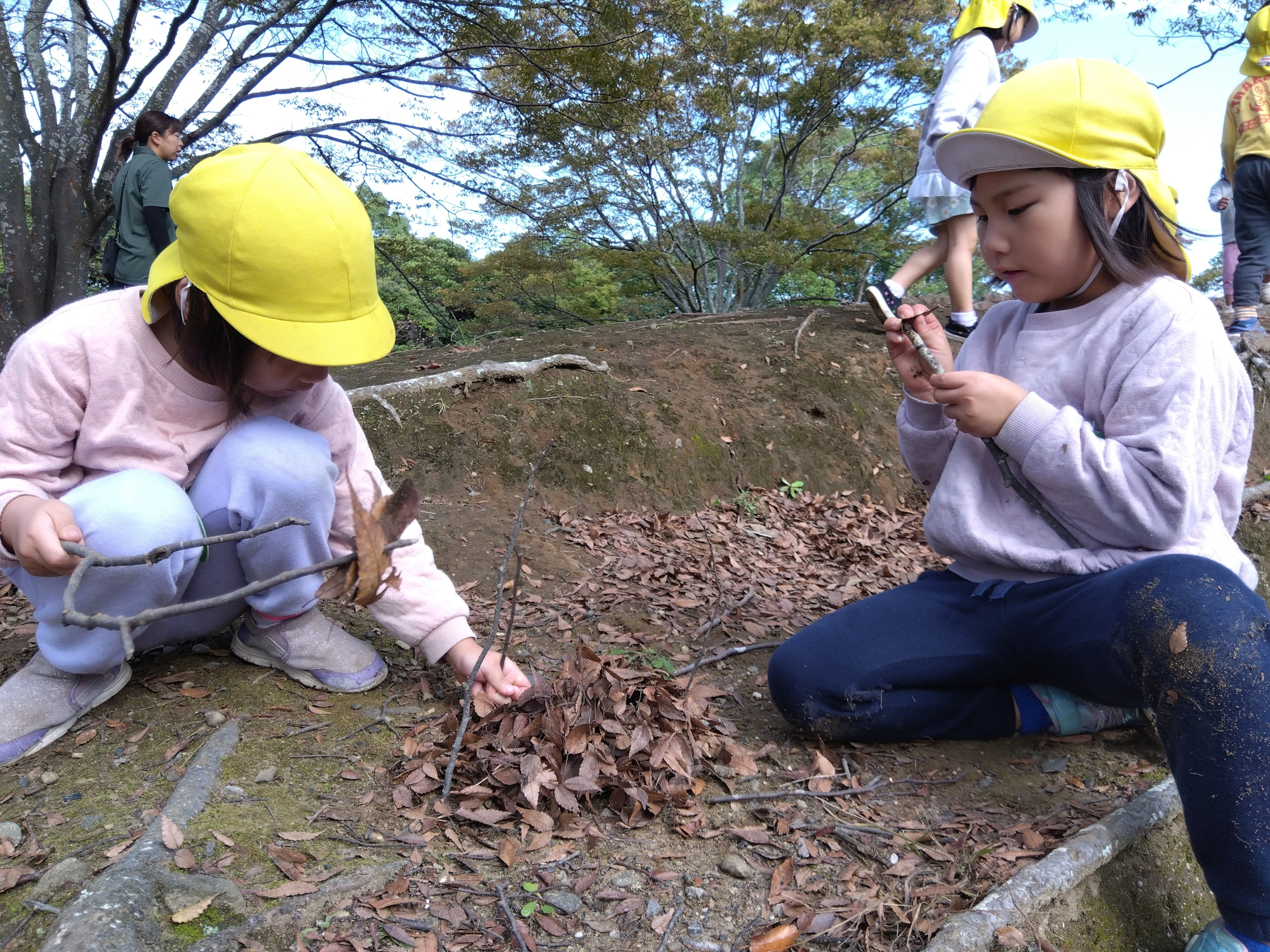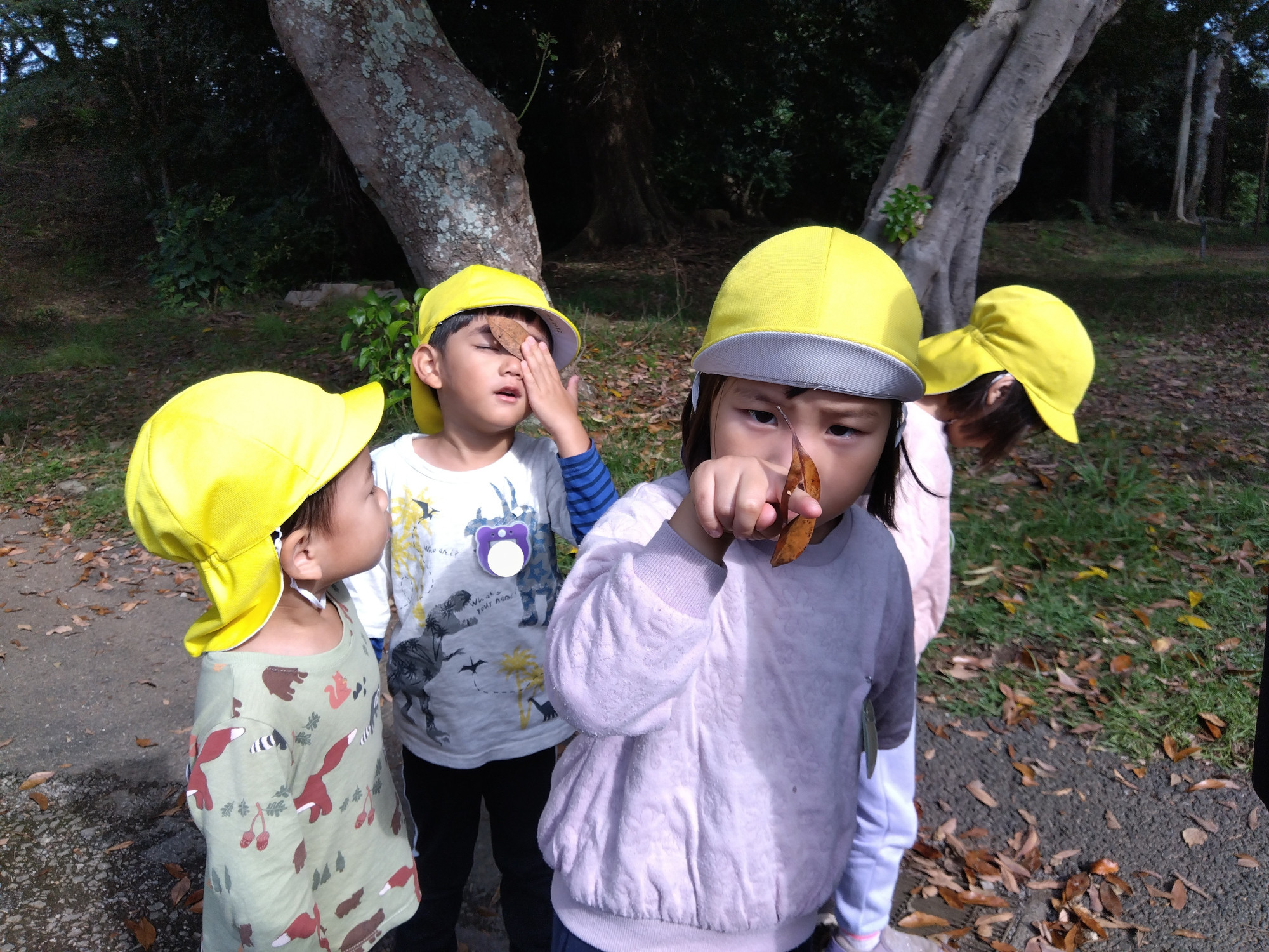 公園には、落ち葉がたくさんありました。落ち葉の絨毯の上を歩いて感触や音を楽しむ姿や「この葉っぱ、王様の帽子みたい」、葉っぱを顔に当てて「見て、白血球だよ(好きなキャラクターになりきる)」、葉っぱに穴を開けて指を通して「指輪ができたよ」、木の枝や落ち葉を集めてキャンプごっこを楽しむ姿など、葉っぱの形の違いに気付いたり、自然物に触れる中でそれぞれ発想を膨らませたりしながら遊ぶ姿がたくさん見られました。