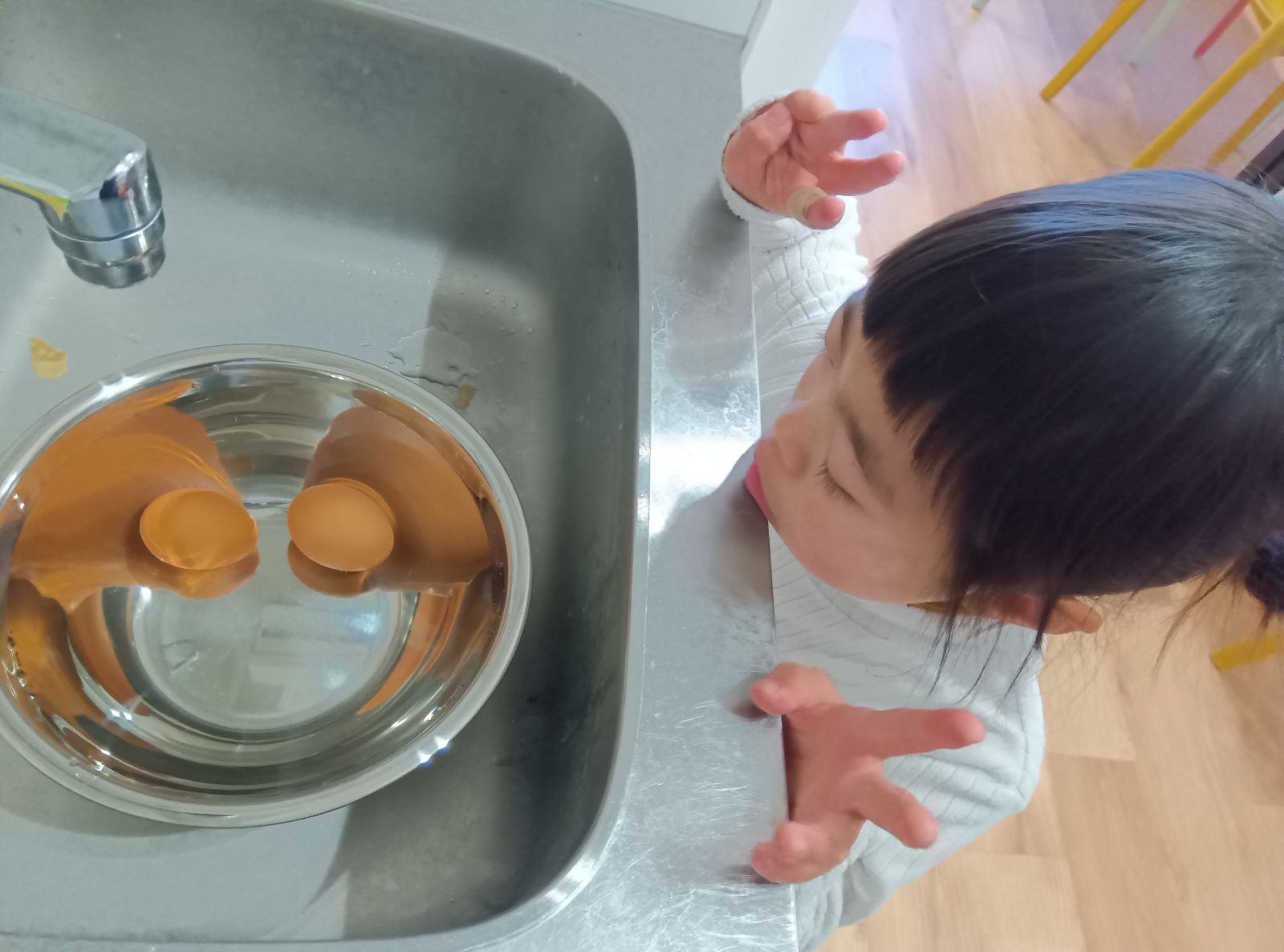 産んだ卵を洗うのも子どもたちが行います。卵の消毒は保育者が行い、消毒をしている様子を「まだかな?」「あと3分?」と指折り数えたり、卵の数を数えたりと数への興味関心に繋がっている姿が見られます。