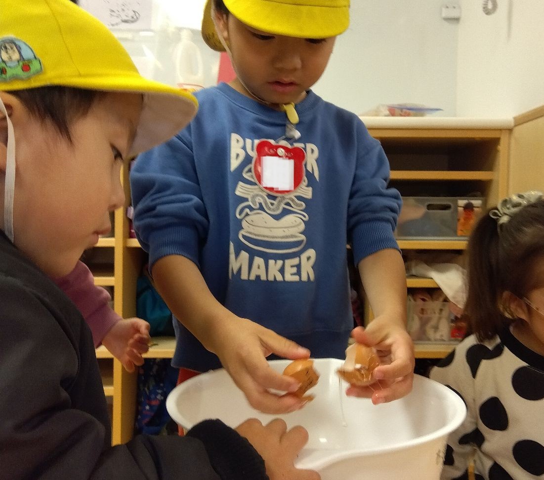 結果、炒り卵にして味付けは砂糖と醤油ですることに決まりクッキングが始まりました。 卵を割る工程では「できるかな?」「ちょっとこわい」「お母さんとやったことあるからできるよ!」といろんな声が子どもたちから聞かれました。まず初めに、家でもやったことがあるA君が挑戦すると「そこでコンコンするんだね!」「すごい」と息を飲みながら見守る姿が見られました。
