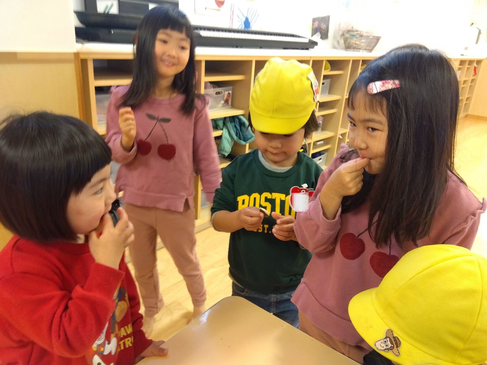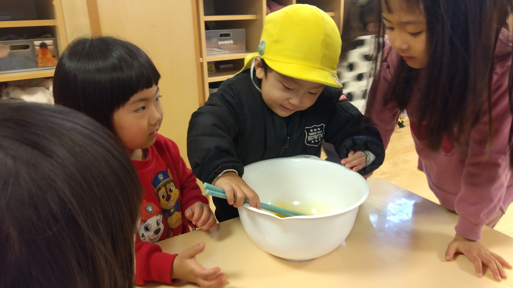 最後の焼く工程は保育者が行いました。焼いていくうちに、卵の香りや醤油の香りがしてくると「おいしそう」「はやく食べたいな」と目を輝かせて出来るのを楽しみに待つ子どもたちの姿が見られました。