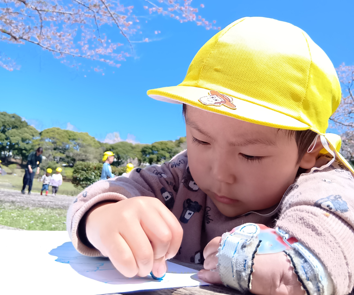 散歩先に画用紙やクレヨンを持っていくと「何描くの?」「やりたい!」と興味をもって子どもたちが集まります。花びらや葉っぱを集めて貼りつける子、公園の絵を描く子、地図を描く子と自由な発想で素敵な作品が作られていきます。初めは興味がなかった子も友達がやっているのを見て「やってみたい」と保育者に伝えてくれました。画用紙を渡すと青いクレヨンを手に持ち真剣な表情で絵を描いていました。